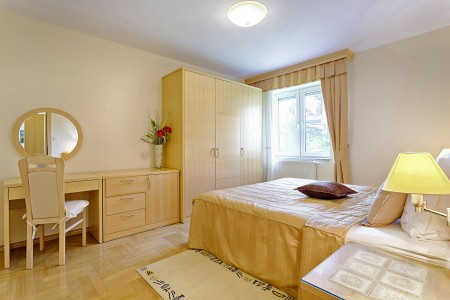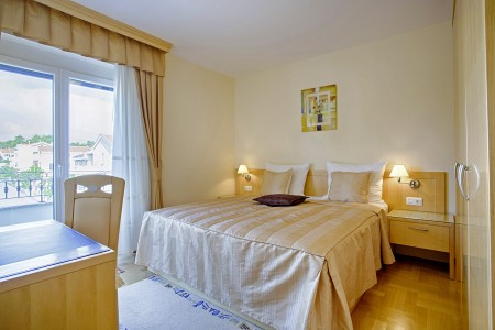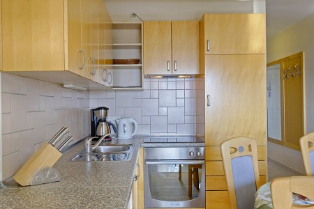 1 apartment for 2-3 persons AP1: approx. 40 m² on the first floor, air conditioning, one bedroom with double bed, bathroom with shower, washing machine, living area with sofa bed and small balcony, safe, kitchen with oven, microwave and dishwasher, dining table. There are shutters and mosquito nets on all windows and balcony doors.