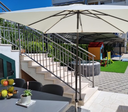 Further details: WiFi available free of charge. The garden includes a trampoline, slide, and swing for children, while an inflatable jacuzzi, a shower and an outdoor dining area invite you to unwind. Parking for three cars is available on the property.