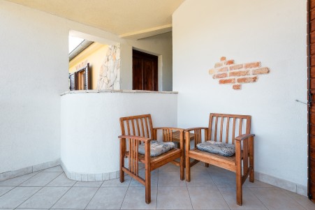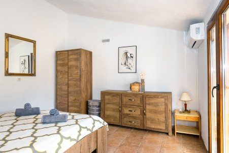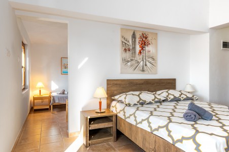 House for 16 persons: approx. 250 m², over two floors. On the ground floor there is a fully equipped kitchen with a living and dining area with air conditioning, two bedrooms, each furnished with a double bed, and a shared bathroom with shower. Additionally, there is another bedroom with a double bed and air conditioning, as well as a bathroom with shower, accessible via a separate entrance. An external staircase leads to the first floor, where three self-contained residential units are located. The first unit consists of an apartment with two bedrooms, each with a double bed, a smaller living area with kitchenette and air conditioning, and a bathroom with shower. The second unit features two bedrooms connected by an open passage, air conditioning, and a bathroom with shower. The third unit includes a bedroom with a double bed, a couch, air conditioning, access to the balcony, and a bathroom with shower.
