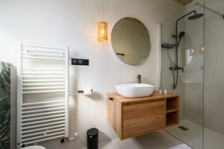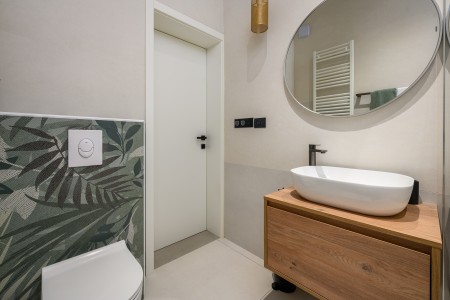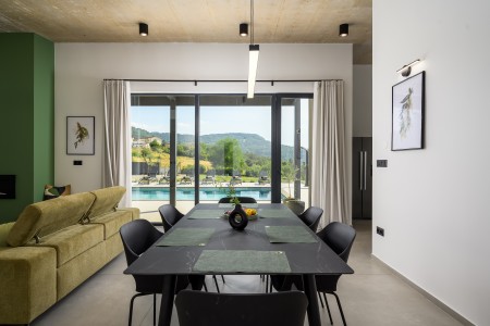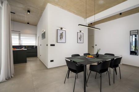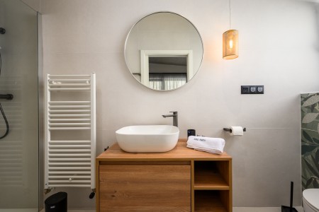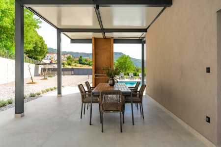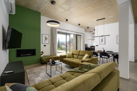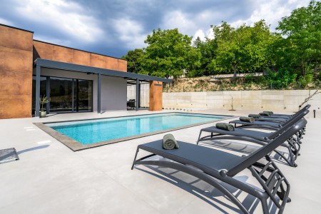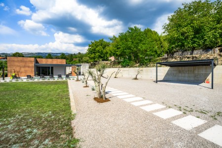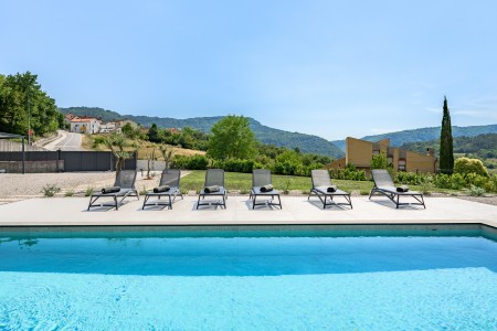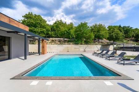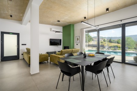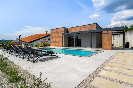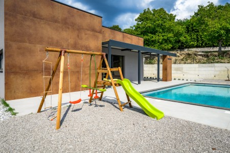 This detached villa is situated in Buzet, in the northern Istria, on a 1,400 m² private plot. The charming old town sits atop a hill and enchants visitors with its medieval atmosphere, narrow alleyways, and sweeping views of the verdant countryside. The region is especially renowned for its truffles – both black and white – which play a central role in local cuisine. In autumn, the Truffle Festival draws food lovers from across Europe. But Buzet offers more than just culinary delights. Just a few minutes away is the paragliding point “Raspadalica,” a popular launch point with spectacular views over the Mirna Valley – a special experience for adventurous guests. Enduro riders will also find excellent conditions here: numerous unpaved roads and forest trails lead through the diverse landscape – ideal for exploring this part of Istria on two wheels. The owners of your accommodation are passionate enduro riders themselves and will be happy to give you personal tips on the best routes in the area. Buzet is roughly 40-minute drive from the coastline, with the nearest beach located at Novigrad. A grocery store is located approximately 400 metres from the house, while the nearest restaurant is around 1,7 km away. Outside, a private swimming pool (9 x 5 m) with sun loungers and an outdoor shower awaits, along with a dedicated children’s playground featuring a swing, slide, seesaw and climbing frame. The interior of the house is tastefully furnished, offering three bedrooms and accommodating up to six guests.