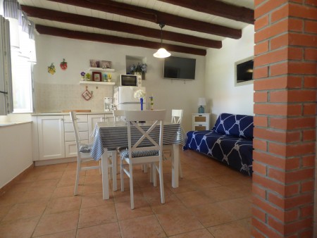House for 3 persons: approx. 40 m², on two levels. The ground floor features a cosy open-plan living area with kitchenette and a guest WC. A narrow and steep staircase leads to the first floor/loft, where you will find a bedroom with a double bed and a single bed, air conditioning, TV and a bathroom with a shower.