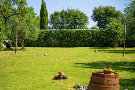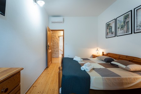House for 8 persons: approx. 160 m², comprising a basement, ground floor and first floor. The basement (approx. 20 m²) features a small wine cellar with a fine selection of local wines. On the ground floor there is an air-conditioned living room with an open-plan kitchen, dining area and an open fireplace. This floor also includes one bedroom with a double bed and TV, as well as a bathroom with a shower. The first floor offers three bedrooms, each equipped with a double bed, TV and air conditioning. Furthermore, on this floor you can find one bathroom with a shower. A covered terrace with seating area and barbecue is located behind the house. The entire property is enclosed by a stone wall approximately 1 m high. The swimming pool (8 × 4 m) with sun terrace, lounge pavilion and outdoor shower with a WC in the garden is available for your exclusive use.