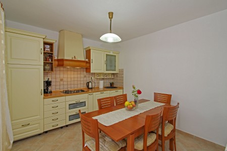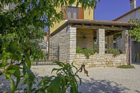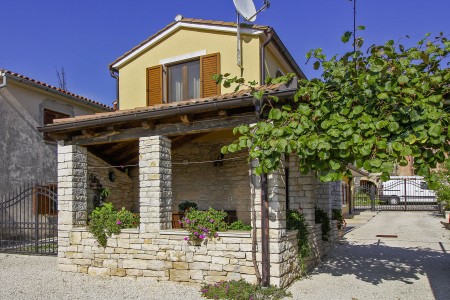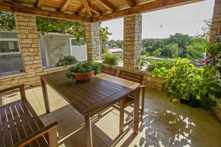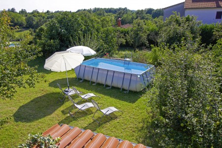 The detached house with two bedrooms and a large fenced garden is located in the small village of Debeljuhi about 18 km away from Rovinj. With its peaceful and quiet setting, the completely newly furnished holiday home is just right for a relaxing stay in rural Mediterranean ambience. In addition to a lovingly furnished interior, there is a well-kept outdoor area with a covered terrace, a set-up pool (5 x 3,80 m), an outdoor shower, and a lovely fruit and vegetable garden.