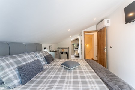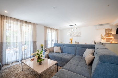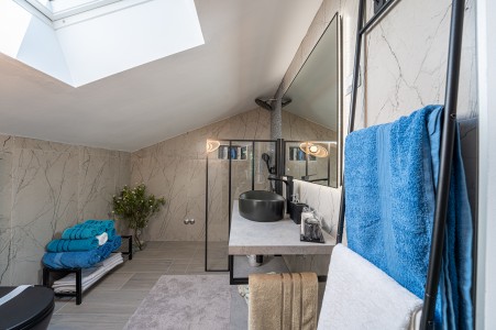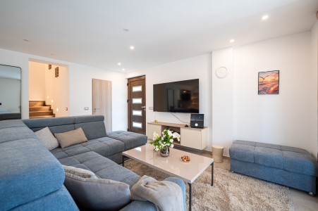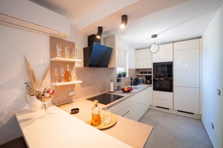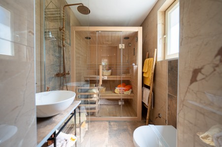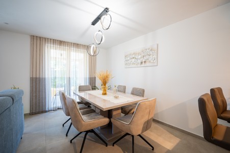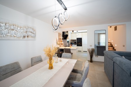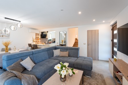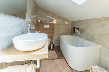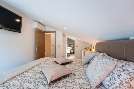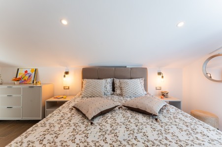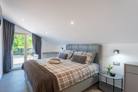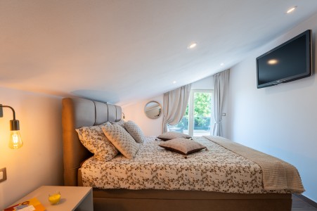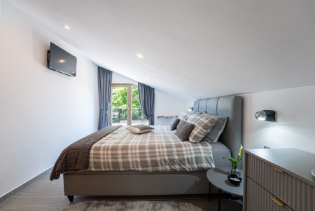House for 4-5 persons: approx. 110 m², on two floors. Newly furnished, with classic charm. The ground floor comprises a fully equipped kitchen with a dining area, air conditioning and a living room with a sofa bed (100 x 190 cm) for one person, as well as access to the terrace with seating. There is also a bathroom with a shower and sauna. On the first floor there are bedrooms, each equipped with a double bed, air conditioning and a TV. Both rooms have access to a shared balcony with a sea view. There is also a bathroom with a shower and another bathroom with a bathtub.