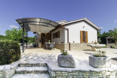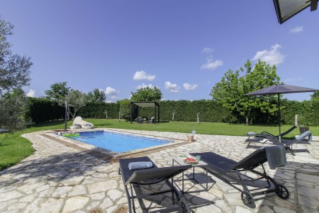 The charming detached house is located on a large, well-kept property with altogether 2,000 m² of land. The only neighbouring house is situated at a distance of approx. 50 metres, and is occupied by the owner's family. The secluded and unique location, surrounded by rolling green hills, vineyards, and meadows, guarantees a relaxing vacation for the entire family. Heading inside, you will find lovely decorated and welcoming rooms provided with all amenities needed for a great vacation. And when it comes to swimming and sunbathing, you’ll certainly enjoy the benefits of having your own private swimming pool (7,5 x 3,5 m) right in front of the door. Furthermore there is a children’s playground in the backyard.