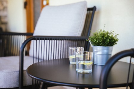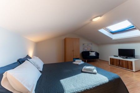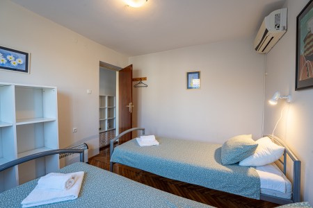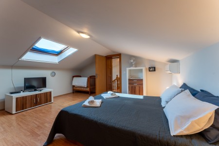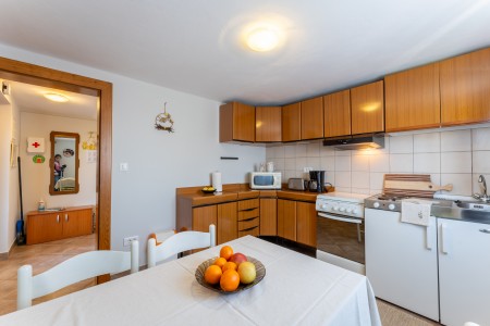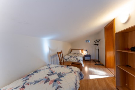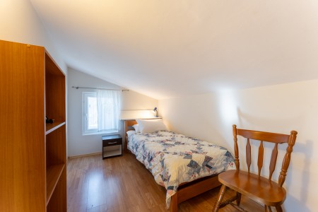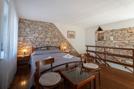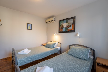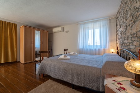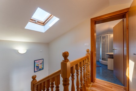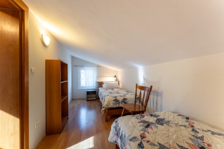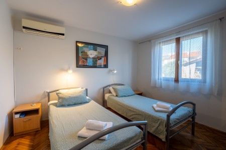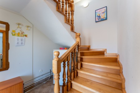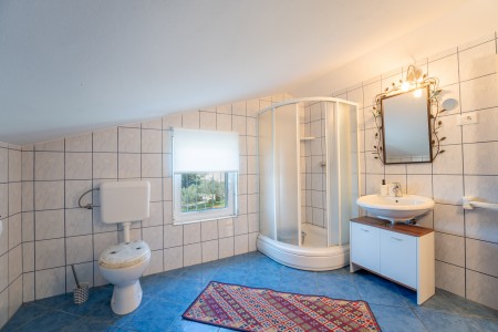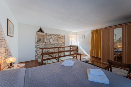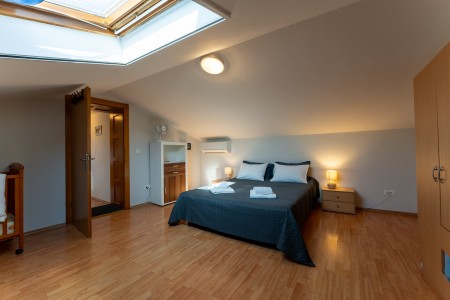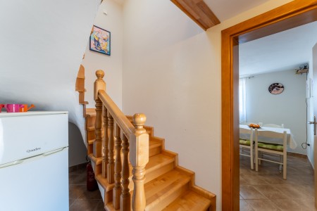 House for 8 persons: approx. 120 m², consisting of two parts that are rented as a single unit. The first apartment (approx. 60 m²) extends over the ground floor and an open gallery featuring a fully equipped kitchen with a dining area and living room, a bathroom with a bathtub, and a bedroom with two single beds and air conditioning, while the open gallery comprises another bedroom with a double bed. An external staircase leads to the second apartment (approx. 60 m²), which extends over the first and second floors. The entrance leads via a covered balcony into a kitchen with a dining area on the first floor. On the second floor there are two bedrooms – one bedroom with a double bed, air conditioning and TV, and the other with two single beds, as well as a bathroom with a shower.