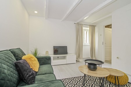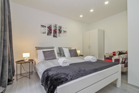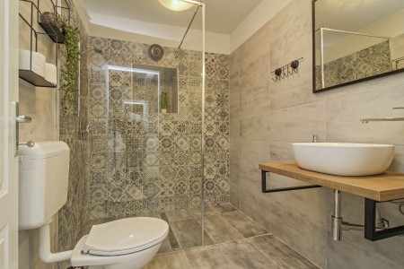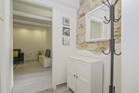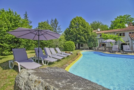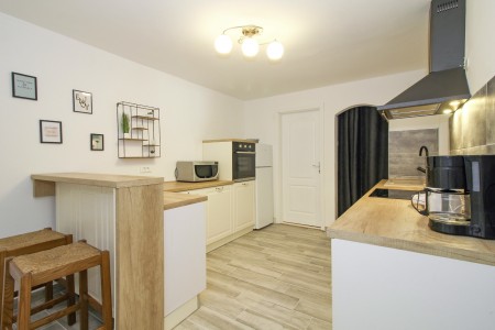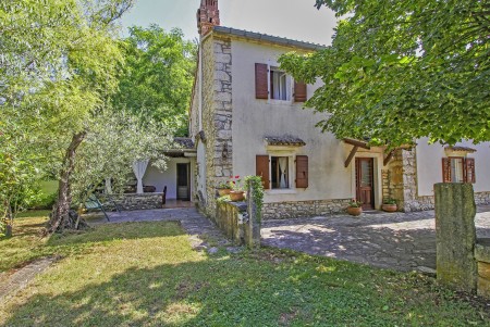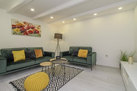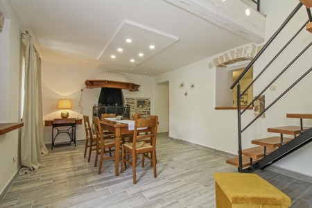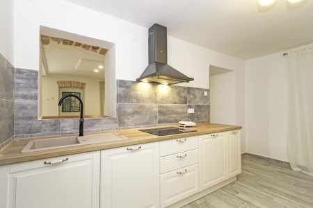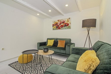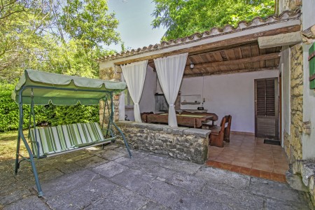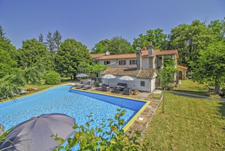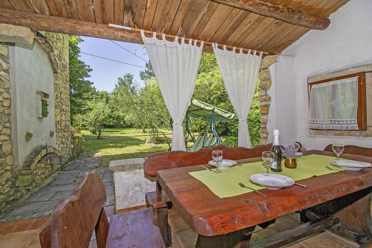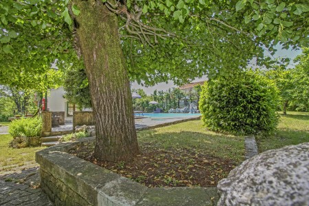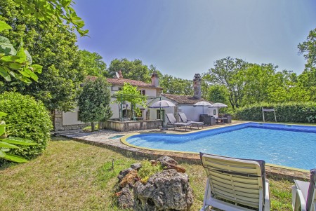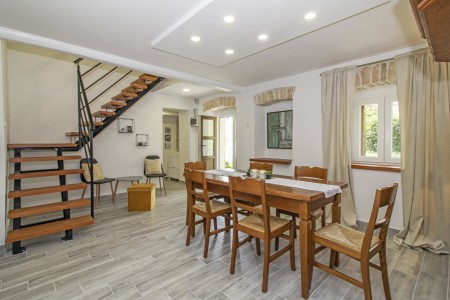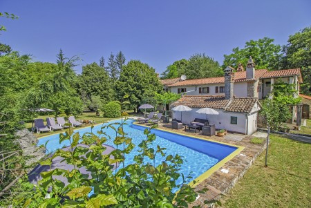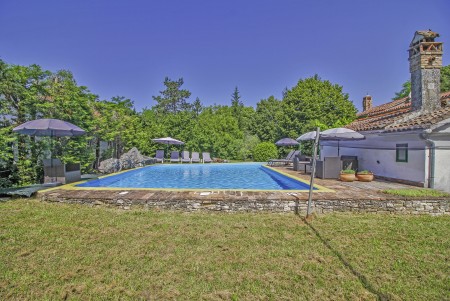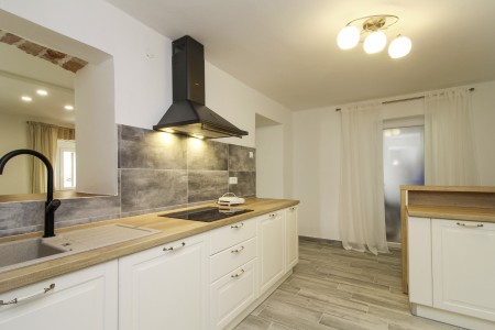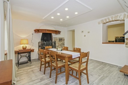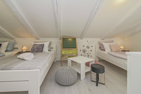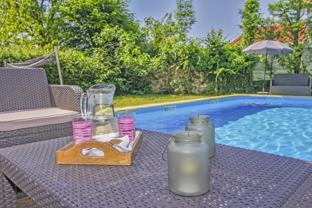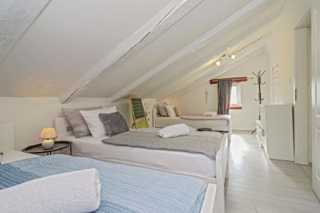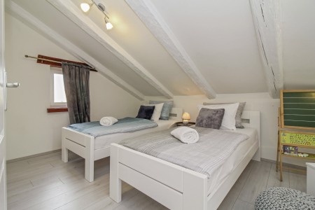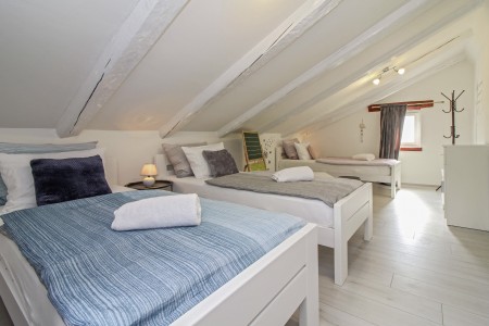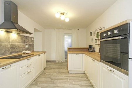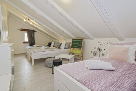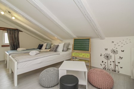 The 250-year-old country estate is situated at the very end of the small village of Kraj Drage. Surrounded by a rural landscape, house Filip combines modern décor with a quiet and peaceful setting. If you are searching for a place a little off the beaten track, this property should be your choice. The house consists of three attached buildings. The first attached house is available for rent, while your host family uses the other two parts for their own purposes. For the 2021 season, the interior of the vacation house has been completely renovated and refurnished. The property has a large private swimming pool (12 x 8 m) with sun loungers and a playground with badminton net.