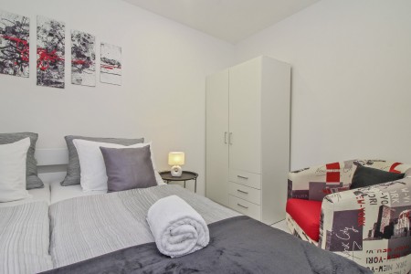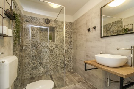 House for 4-5 persons: approx. 100 m² on two floors. On the ground floor, there is a modern, fully equipped kitchen, a separate dining room, a living room with a comfortable sofa set and two bathrooms with shower. On the first floor, there are two bedrooms – one with three single beds and one bedroom with a double bed. The air conditioner is located in the staircase.