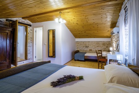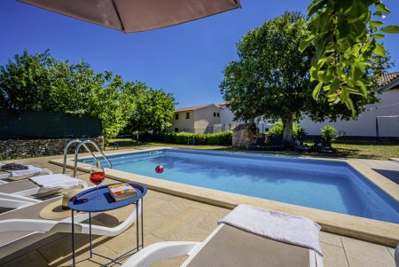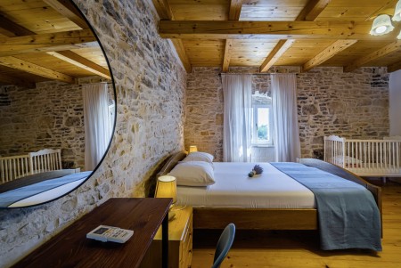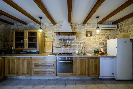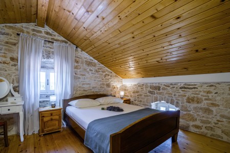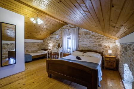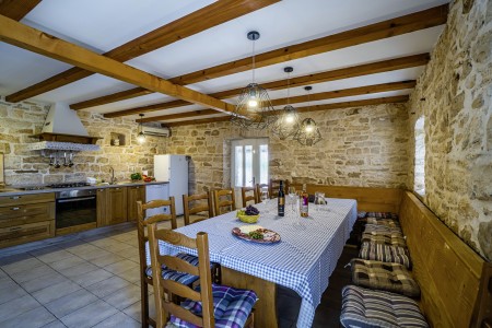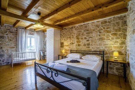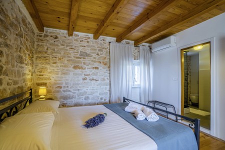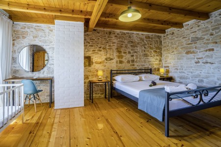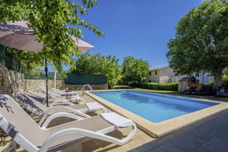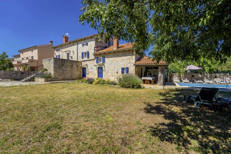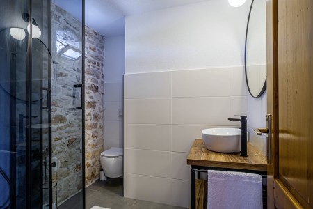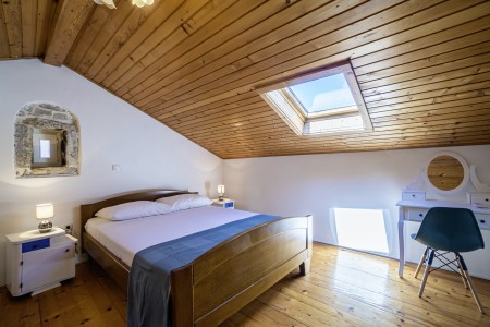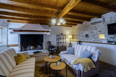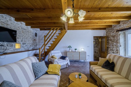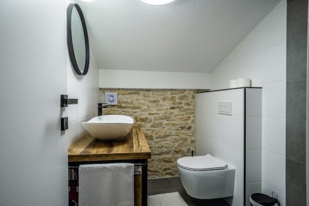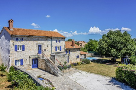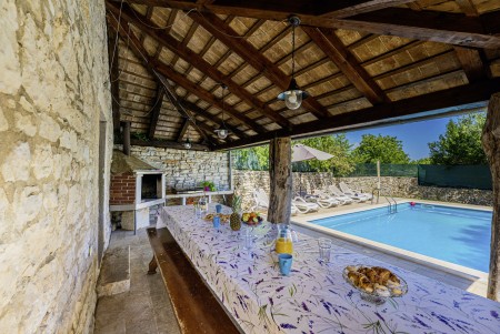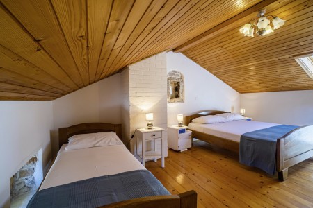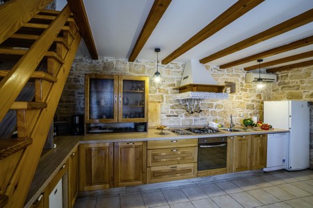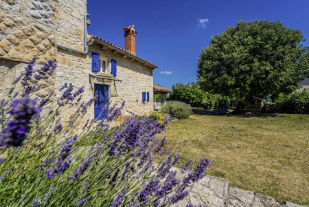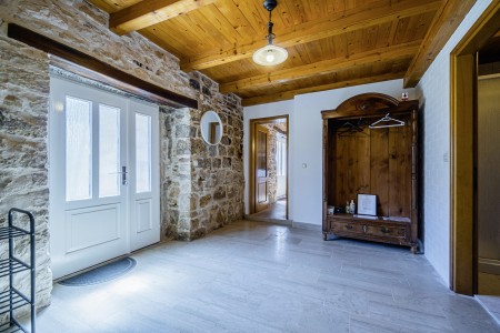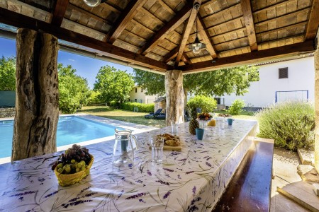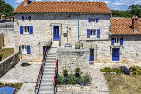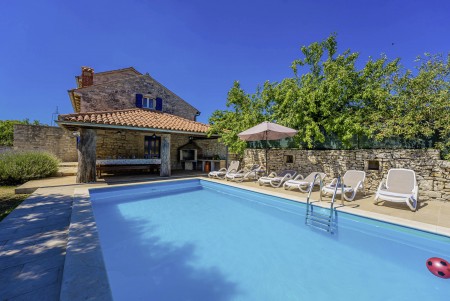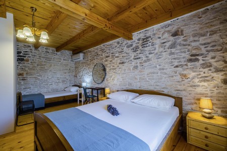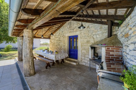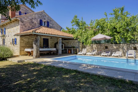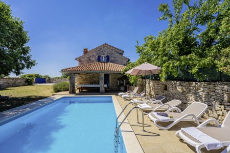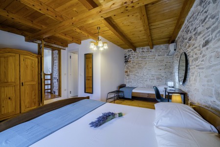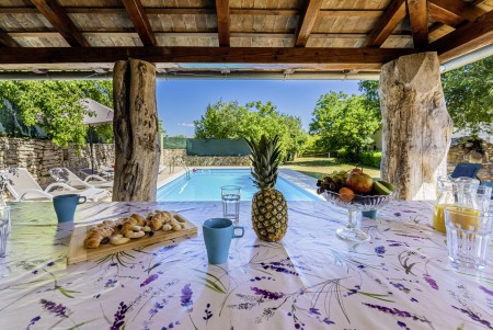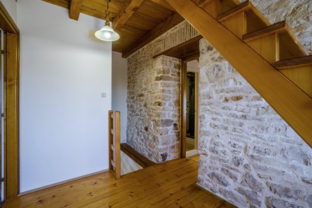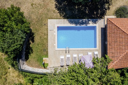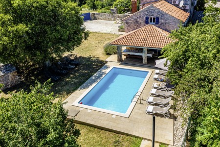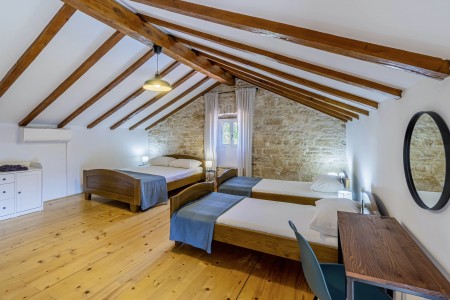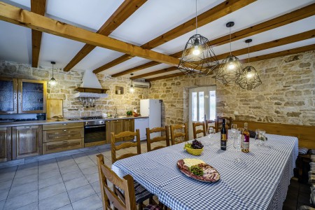 The large detached stone house is located in Štokovci, a peaceful and quiet village in the central part of Istria. You are just a fifteen-minute drive from the coast, and a five-minute drive from local amenities. Featuring welcoming interiors with five spacious bedrooms and three bathrooms, the house offers more than enough space for a large family or a group of friends, who desire to spend their vacation in a relaxing and private atmosphere. All rooms are decorated in traditional Istrian style, emitting a cozy home-from-home atmosphere. Outside, you will find a covered terrace and a large yard with private swimming pool (7 x 4 m) and sun loungers. Your hosts, Mario & Dina live in the neighbouring village, where they run a farm with chickens and pigs. Don’t miss out on asking them for home-made produce like their delicious air-dried ham, which is offered for purchase. Mario & Dina will also gladly provide you with fresh vegetables from their own garden, eggs, olive oil and wine.