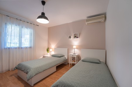 House for 4 persons: approx. 65 m² on ground level, comprising a bedroom with twin beds connected to another bedroom with double bed, a bathroom with shower, and an open-plan living/dining area including a kitchen, a couch and an open fireplace. Both bedrooms are equipped with air conditioning. In front of the house, you will find a spacious terrace (approx. 29 m²) with seats and lovely views of the Mediterranean garden.