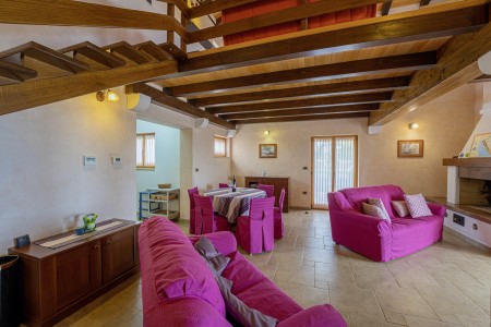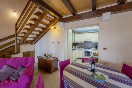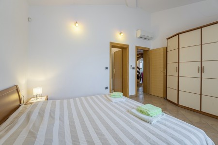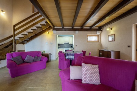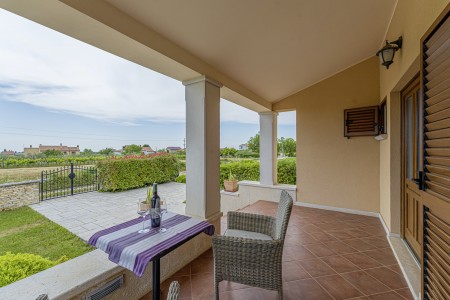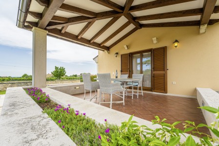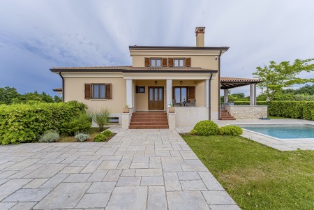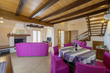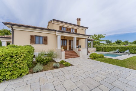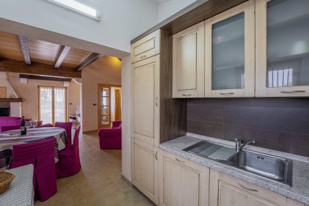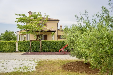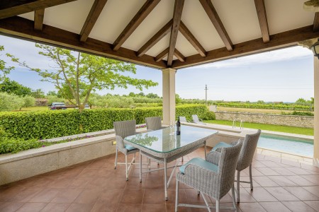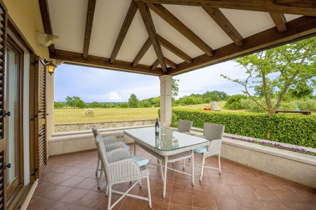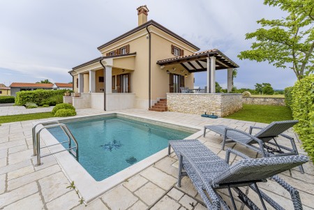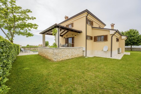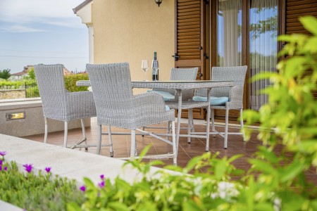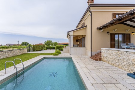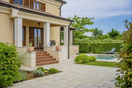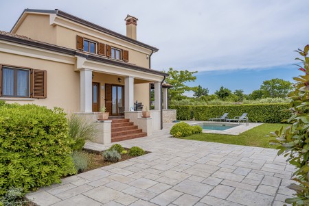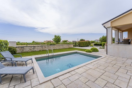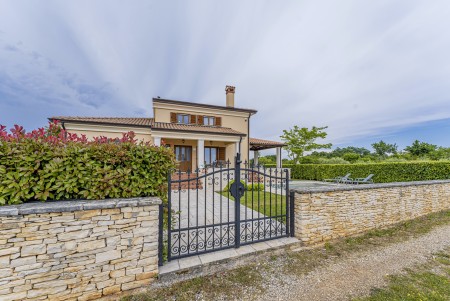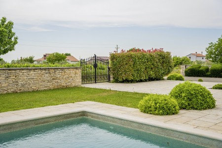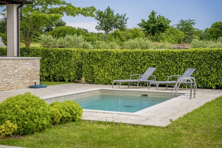 Offering a quiet and peaceful setting combined with all amenities needed for a comfortable stay, the newly built property is situated on the edge of the small Istrian town of Kanfanar. This place offers not only ideal conditions for a vacation in a rural atmosphere far away from disturbing traffic noise, but is also the right choice if you desire to explore the beautiful surroundings. Due to its favourable position in the central part of the Istrian peninsula, the nearby villages as well as numerous lovely beaches are reachable by car within a few minutes. The large garden fenced by stone walls ensures privacy and security, and a private swimming pool (6 x 4 m) framed by a sun terrace with loungers makes it all perfect. Heading inside you’ll find lovely decorated interiors combining modern architecture with traditional Istrian elements.