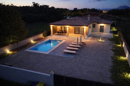 This comfortably furnished single-story house with three air-conditioned bedrooms and a completely fenced, well-kept plot (950 m²) with a pool (7,5 x 4,5 m) is located in the small village Kapelica, that is part of the Labin municipality. The sun terrace with sun loungers is perfect for fully enjoying warm days and mild evenings. Furthermore, the villa is the perfect starting point for exploring the beauties of Istria – from the picturesque landscape surrounding the property to the lively coastal towns. The well-known towns of Pula, Rovinj, and Opatija are within a radius of 60 km and are easily accessible by car, while the popular beaches in Rabac are just 5 km away. The best pizzeria in the area, Rumore, can be found in the charming old town of Labin (2 km). The nearest grocery store is only 500 m from the house.
