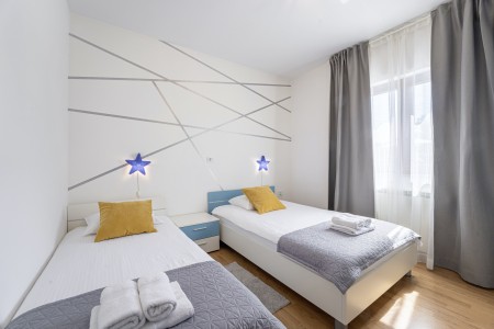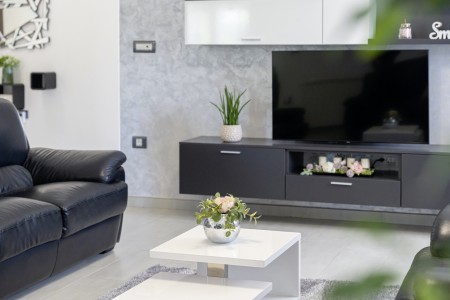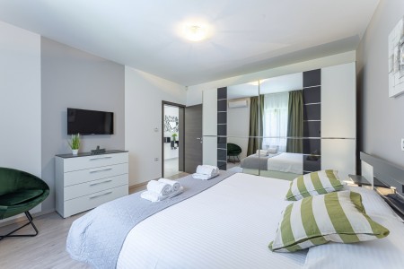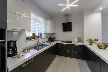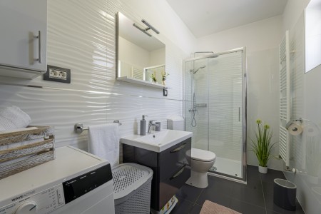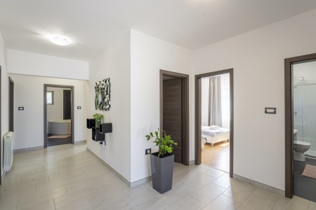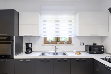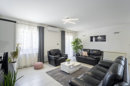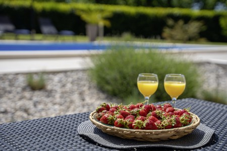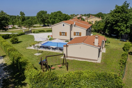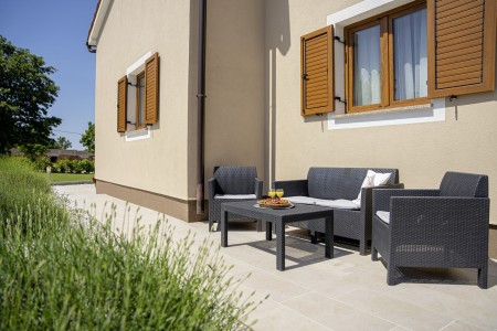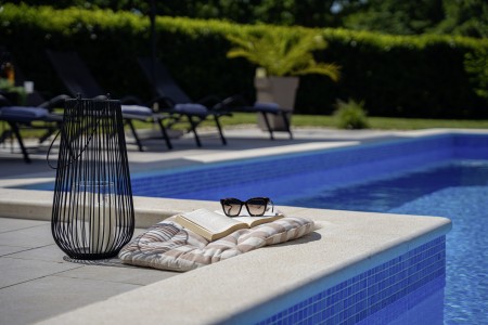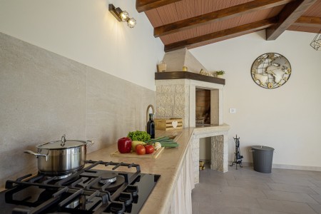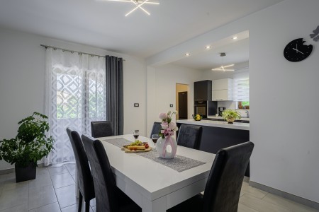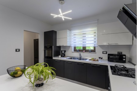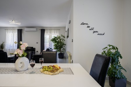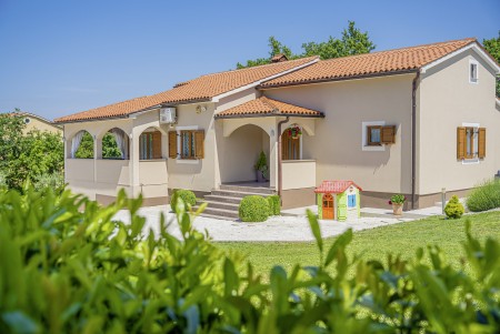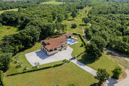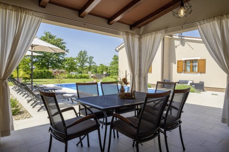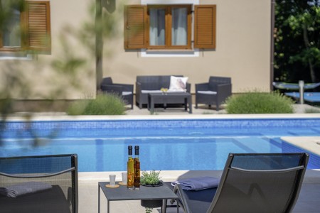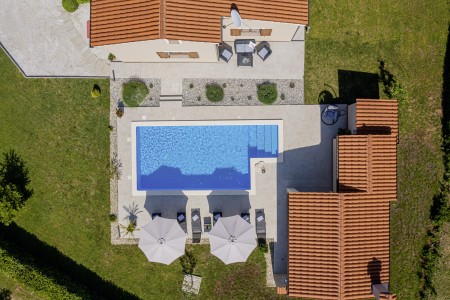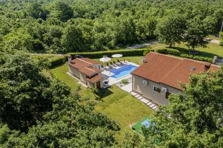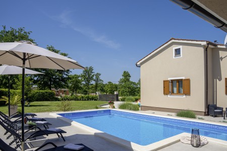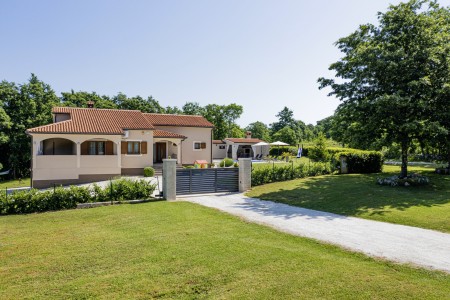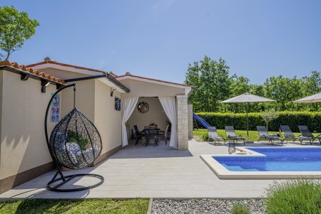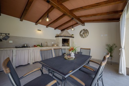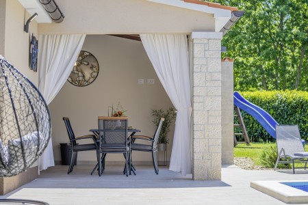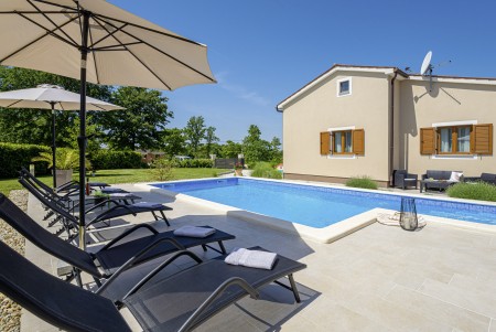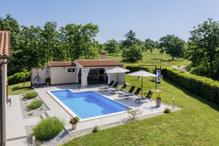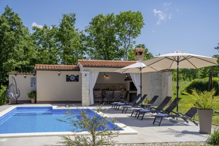 The detached villa is located just outside the village of Cukrići on a 1,600 m² fully fenced plot, which guarantees peace and privacy. Surrounded by greenery and a uniquely beautiful landscape, this villa offers the best conditions for a relaxing stay, whether with friends or family. The well-kept outdoor area awaits you with a garden, private pool (8 x 4 m), summer kitchen with barbecue and a covered outdoor dining area. The modernly furnished interior of the villa offers three comfortable bedrooms and two bathrooms in addition to a large open-space living/dining area. The small village of Cukrići is about 10-15 minutes by car from the coast, the nearest beaches are located near Bale. In the historic village of Svetvinčenat, which is about 8 km away, you will find not only a restaurant, café-bars, pizzeria and shopping facilities, but also an exciting excursion destination for young and old. The center of the village is the historical fort Morosini-Grimani, which in summer is the scene of numerous events with music and various performances. In addition, several exhibitions can be visited and there is even an Escape Game adventure offered.