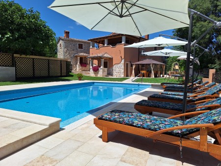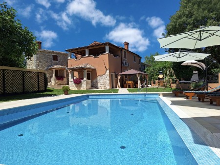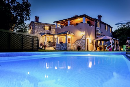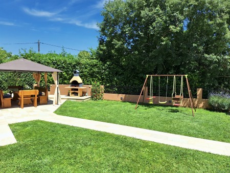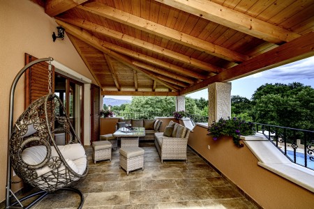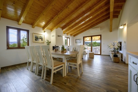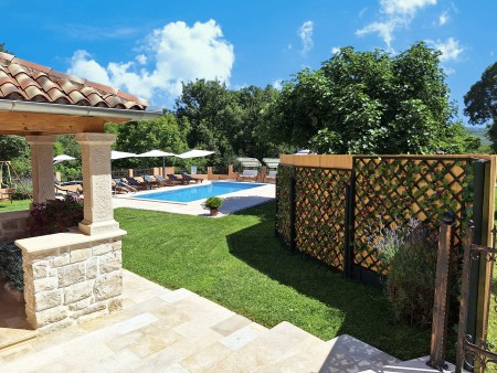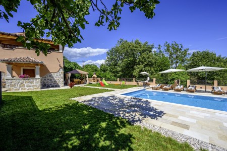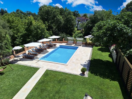 Nestled in the peaceful village of Zajci, a mere 5-minute drive from the historic hilltop town of Pićan, this comfortable holiday villa is situated on a completely fenced property, reserved for your exclusive use. Surrounded by lush greenery and the unique beauty of nature, with expansive olive groves, vineyards, forests, and fields, it offers a perfect setting for relaxation. The villa features a large, fenced garden, ensuring peace and privacy. Guests can enjoy a private swimming pool (4,5 x 9 m) with a sun terrace, outdoor shower, and comfortable sun loungers, as well as a play ground for children and an outdoor barbecue and dining area. The interior is furnished to a high standard, offering four bedrooms and a high level of comfort. The surroundings are ideal for extensive bike rides and hikes through the evergreen nature, and climbing Mount Učka rewards with a magnificent view. A nearby hiking trail leads to the enchanting Sopot waterfall. For beach holidays, the “Copacabana” beach, located below the historic town of Plomin, is just a 15-minute drive away, while the well-known beaches in Rabac are about 20 km away. The vibrant cities on Istria's west coast, such as Poreč, Rovinj, and Vrsar, with their numerous beaches, entertainment, and shopping options, are easily accessible by car.