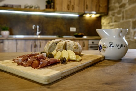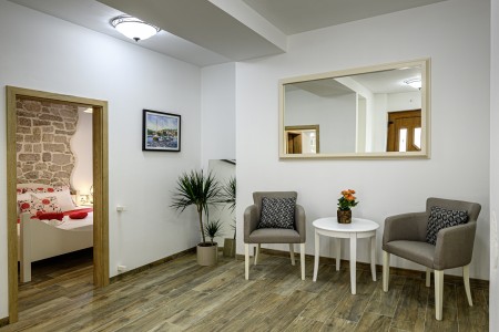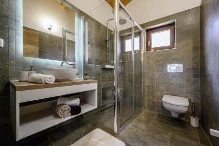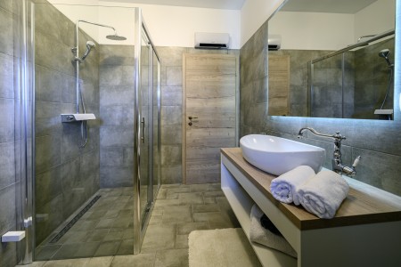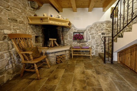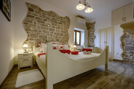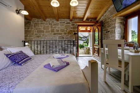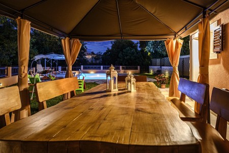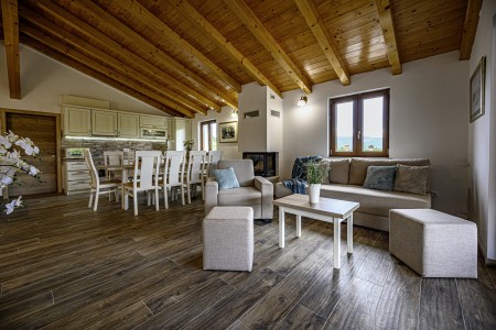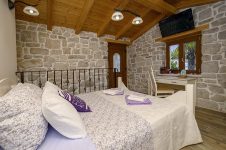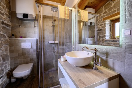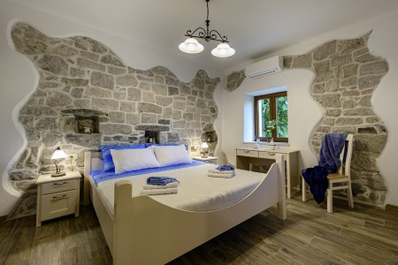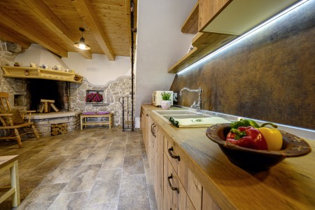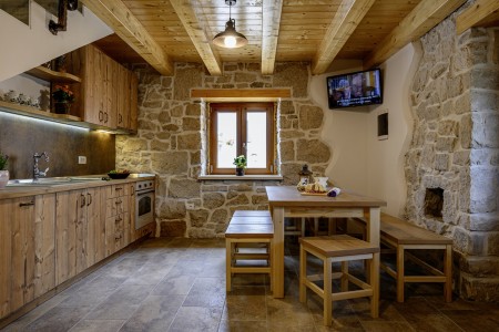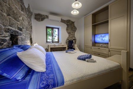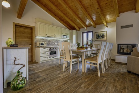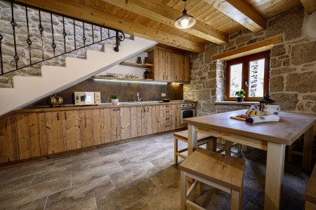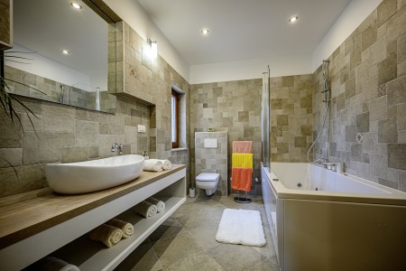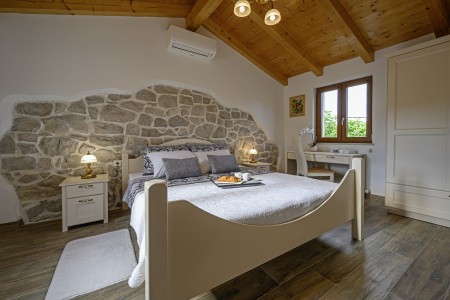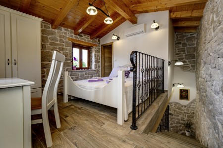 House for 8-10 persons: approx. 215 m², consisting of two parts that are rented as a single unit. The larger house has about 170 m² of living space on two floors – the ground floor features two bedrooms with double beds, TV, and air conditioning, two bathrooms with showers, and a bathroom with a hydro-massage bathtub. The first floor has a spacious living/dining area with air conditioning, TV, a pull-out couch (160 x 200 cm), a fully equipped kitchen, and direct access to the covered terrace with a lounge set, rocking chair, and lovely views of the pool. There is also a bedroom with a double bed, air conditioning, and TV, and a bathroom with shower. The smaller house offers about 45 m² of living space on two floors – the ground floor comprises a fully equipped eat-in kitchen with a dining table, TV, and a romantic open fireplace. The first floor offers a bedroom with a double bed, air conditioning, TV, and a bathroom with shower.