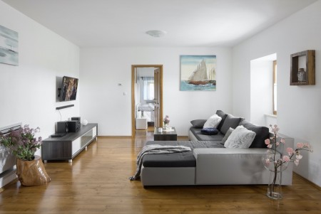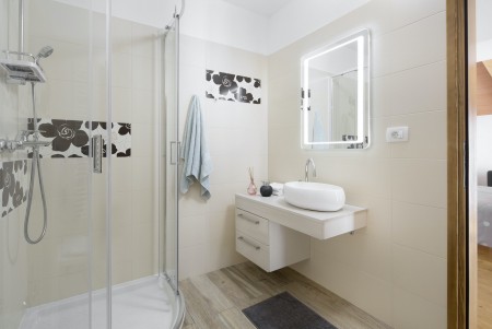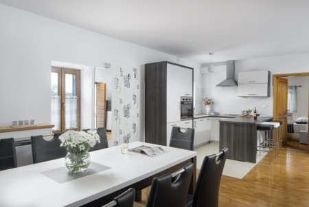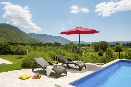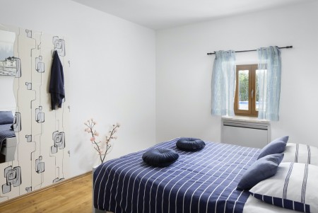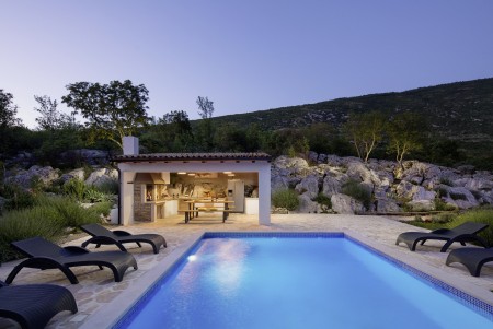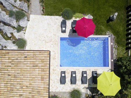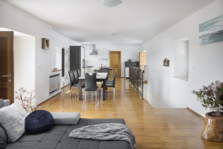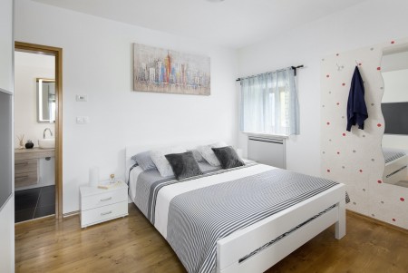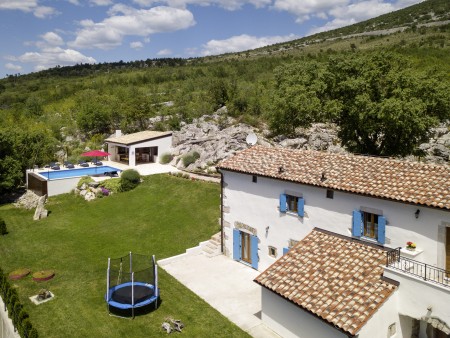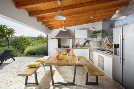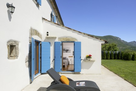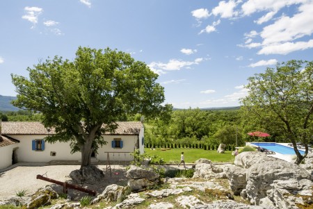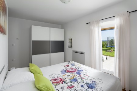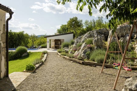 The lovingly restored, tastefully and modernly furnished house is located in Nova Vas, a small village not far from the east coast of Istria. Surrounded by greenery and a uniquely beautiful landscape with extensive olive groves, vineyards and forests, Villa Elia is the perfect place to relax in peace and privacy. The villa is situated on a large plot of land with a very well-kept garden. In addition to a private swimming pool (4 x 8 m) with sun terrace, outdoor kitchen, outdoor shower and sun loungers, a private children's playground with swing, slide, climbing frame and sandpit as well as a trampoline awaits you. The interior of the house is modernly furnished, offering a high level of comfort with four spacious bedrooms and four bathrooms. The surrounding area is ideal for long walks through the evergreen countryside, and those who climb the mountain Učka will be rewarded with breathtaking, panoramic views of Istria. The lovely beach "Copacabana", set below the historic town of Plomin, can be reached by car in about 15 minutes. The more frequented beaches in Rabac are about 25 km away.