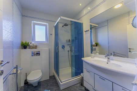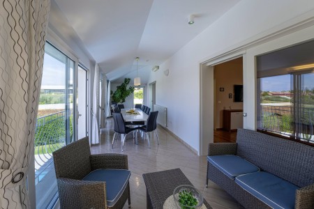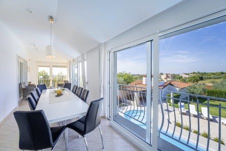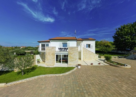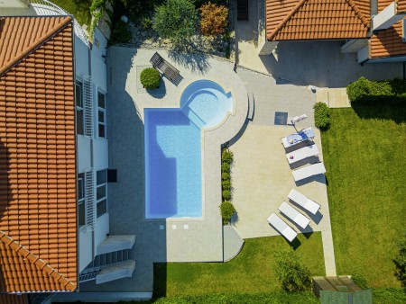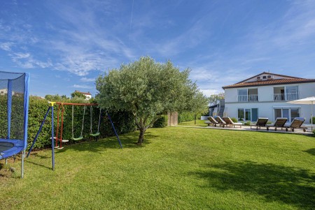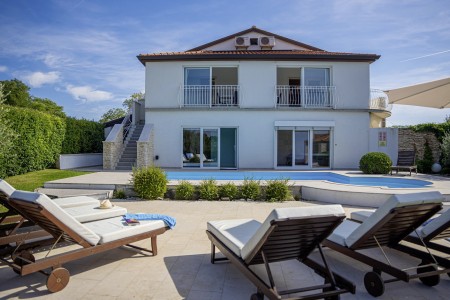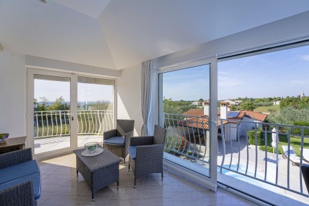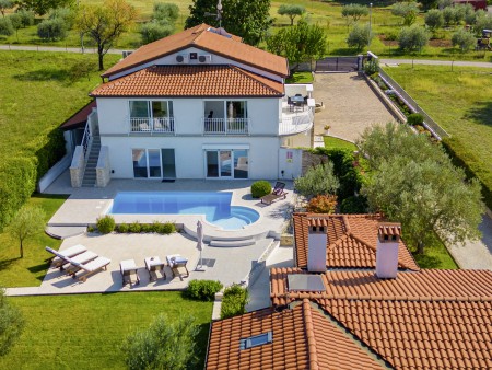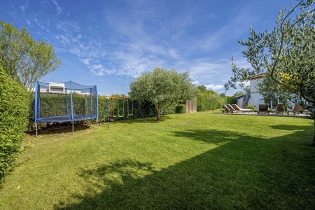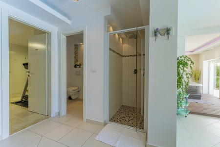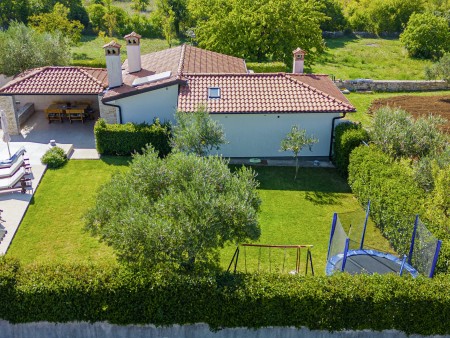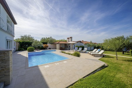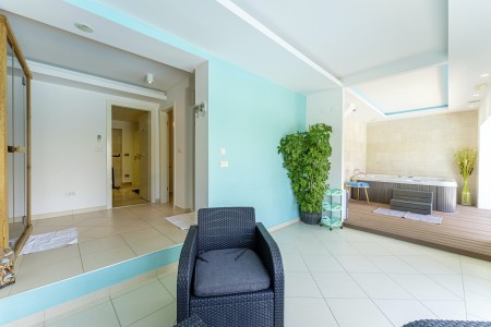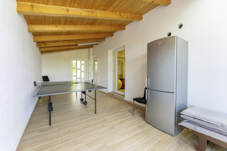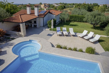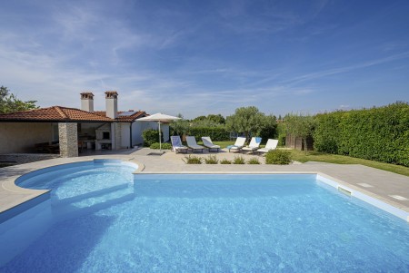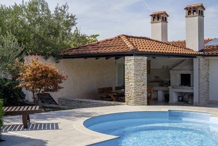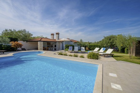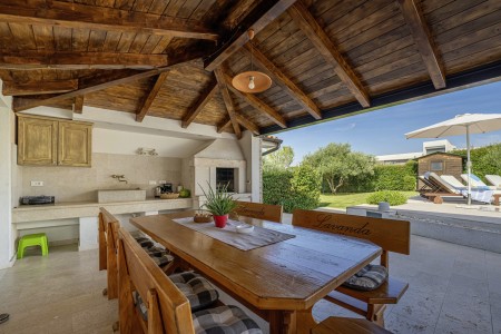 Situated in Kanfanar on a sprawling 1500 m² fenced estate, Villa Lavanda Allegra offers an oasis of tranquility and privacy. Surrounded by lush greenery and a captivating landscape, the villa provides an idyllic setting for a rejuvenating stay, whether you're vacationing with friends or family. The meticulously maintained outdoor area features a garden, a private pool measuring 8 x 4 meters, comfortable sun loungers, a barbecue grill, and a terrace with a covered alfresco dining area. The villa's interior is thoughtfully designed for comfort, boasting a spacious living area overlooking the pool and three bedrooms located on the first floor. The ground floor is dedicated to wellness, complete with a sauna and fitness room. Kanfanar is approximately 15 minutes by car from the coast, with the nearest beaches located in Bale. The neighboring town of Svetvinčenat, situated about 5,5 km away, offers not only restaurants, cafes, pizzerias, and shopping facilities but also serves as an intriguing destination for all ages. The town is centered around the historic Morosini-Grimani Castle, which hosts a variety of summer events featuring music and performances. Additionally, several exhibitions are available for visitation, and an escape game adventure is also offered.