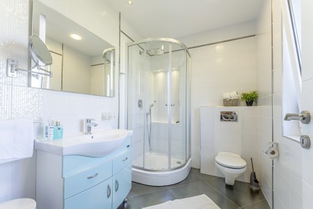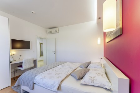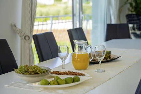 House for 6-8 persons: approx. 220 m² spread over two floors. The ground floor houses the wellness area, complete with a lounge corner, TV, Wi-Fi speakers, ping-pong table, fitness room, sauna, as well as a shower and toilet. The first floor features a fully equipped kitchen, a dining room with views of the pool, a spacious living room with air conditioning and a pull-out sofa (160 x 200 cm), a balcony, three double bedrooms, two bathrooms with shower, and an additional separate toilet. All bedrooms are equipped with a television and air conditioning.