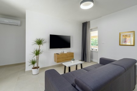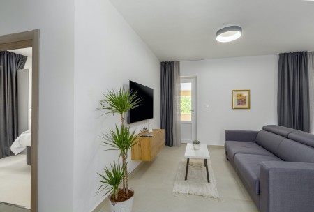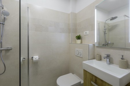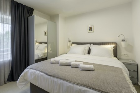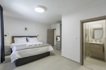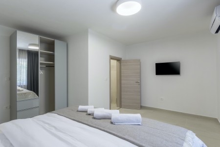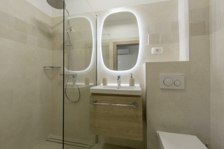 House for 4-6 persons: Approximately 100 m² on the first floor, comprising a living/dining area with a sofa bed (160 x 190 cm) for two children up to 15 years of age, a fully equipped kitchen, dining table, and direct access to the large covered terrace with views of the pool and the adjacent children's playground. Additionally, there are two comfortable bedrooms with double beds, TVs, air conditioning, and en-suite bathrooms with showers. There is also a separate WC. The ground floor of the house is neither rented out nor inhabited.