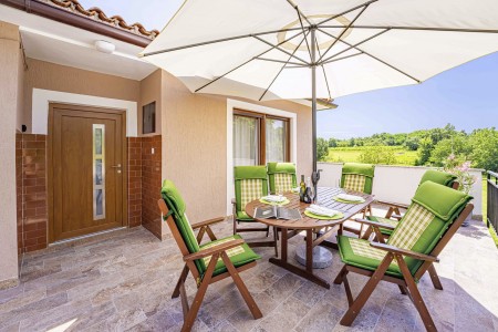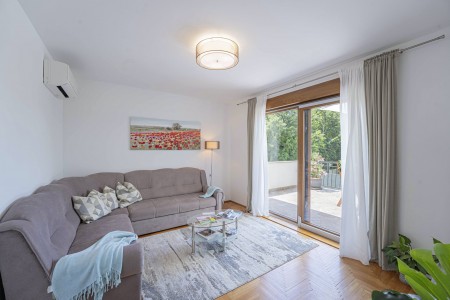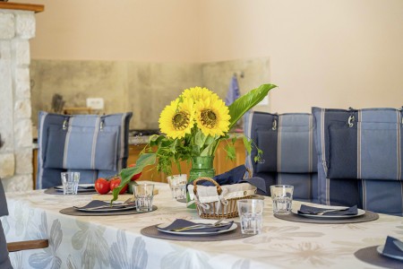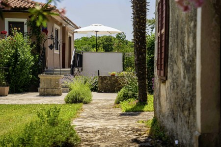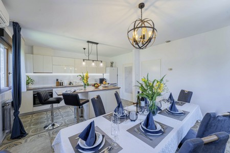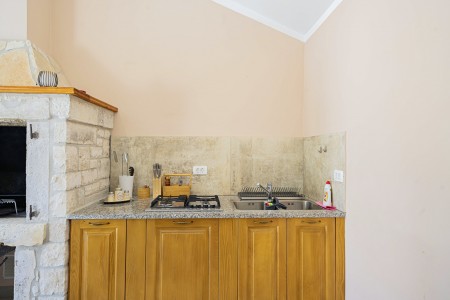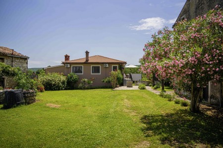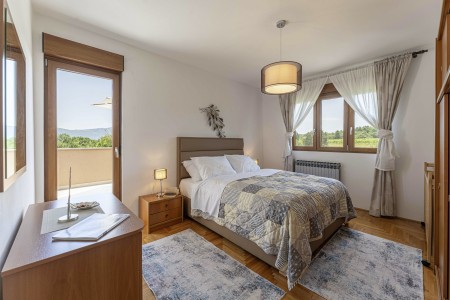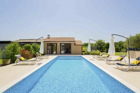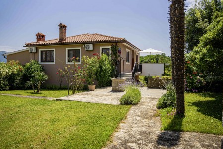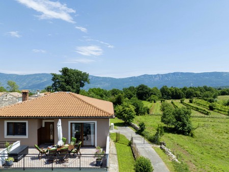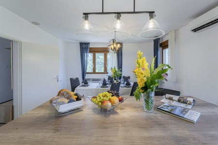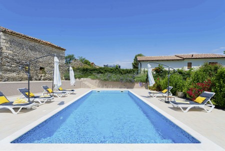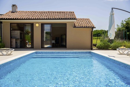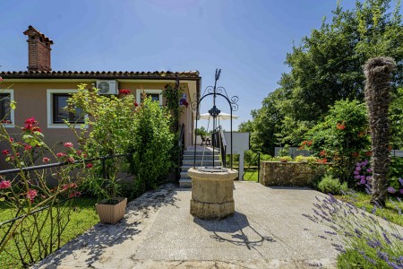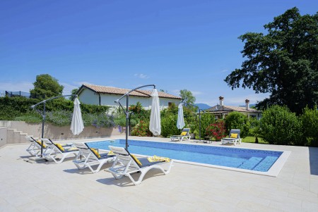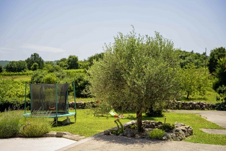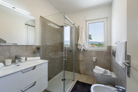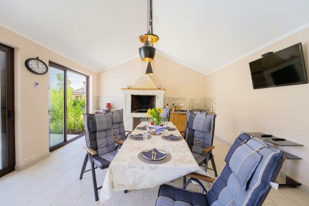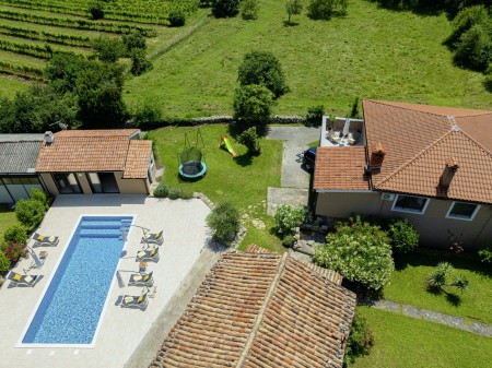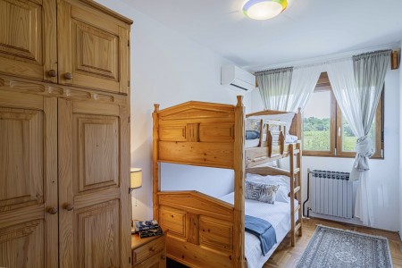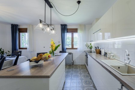 The detached house, charmingly named Villa Mendula, is located in Čambarelići, a small and tranquil village that is part of the Kršan municipality. The area is renowned for its uniquely beautiful landscape, featuring expansive fields, meadows, vineyards, and forests, providing an excellent setting for both relaxation and active pursuits. The outdoor area boasts a private swimming pool (4 x 10 m) with a sun terrace, sun loungers, and parasols. The highlight of the exterior is a pool house with a fully equipped summer kitchen, including a barbecue fireplace, dining area, and TV, with large sliding doors that open towards the pool. The surroundings are perfect for long bike rides and hikes through the evergreen landscape. Those who climb Mount Učka will be rewarded with breathtaking views. For a beach holiday, the location is also ideal, with the “Copacabana” beach, situated below the historic town of Plomin, only 10 km away and easily accessible by car. The more popular beaches in Rabac are about 20 km away. The best pizzeria in the area can be found in the picturesque old town of Plomin, approximately 10 km away. The nearest shopping facility is just 1,5 km from the house.