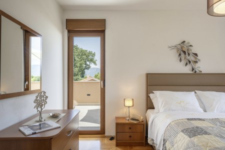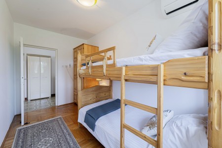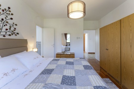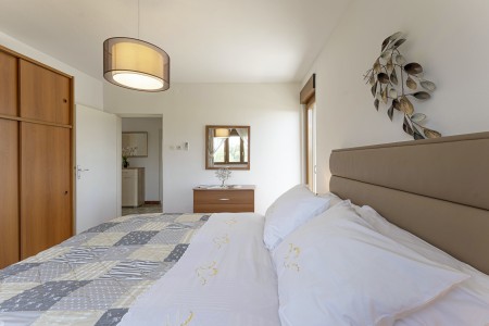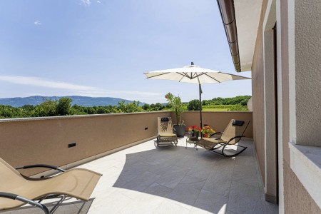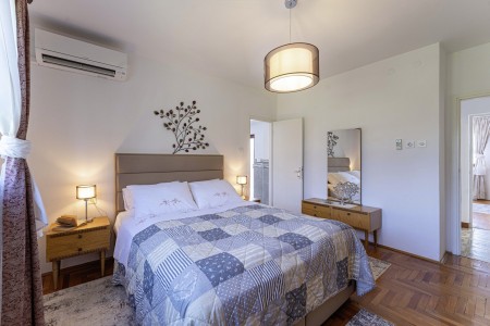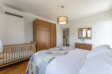 House for 6-7 persons: Approx. 143 m² on the first floor. The house features a modern, fully equipped kitchen with a kitchen island, air conditioning, and a dining area, as well as a separate living room with a sofa bed (120 x 190 cm) for one person, air conditioning, and direct access to the large terrace with table and chairs. Additionally, there is a bedroom with a bunk bed and air conditioning, a bathroom with shower, a bedroom with a double bed, air conditioning, and a terrace with a beautiful view of the landscape, and another bedroom with a double bed, air conditioning, and a very spacious bathroom with a walk-in shower, bathtub and two sinks. The ground floor of the house is neither rented nor inhabited.