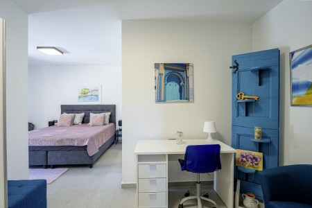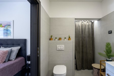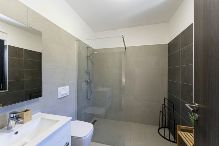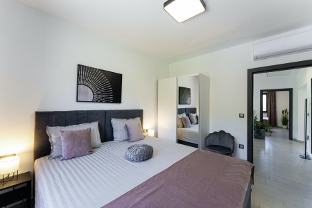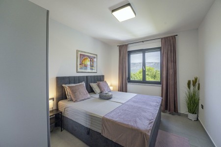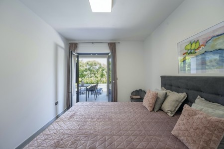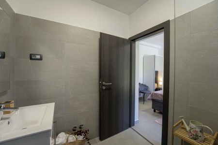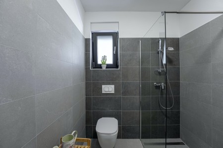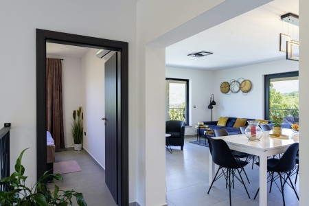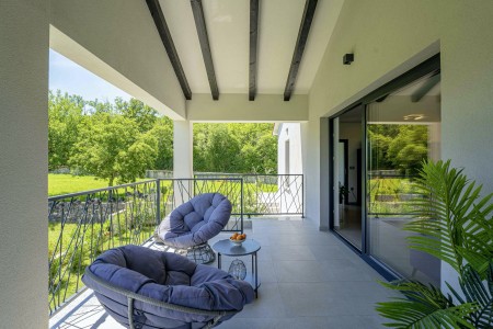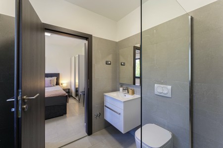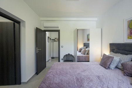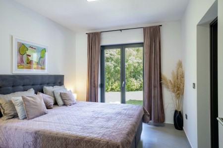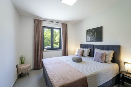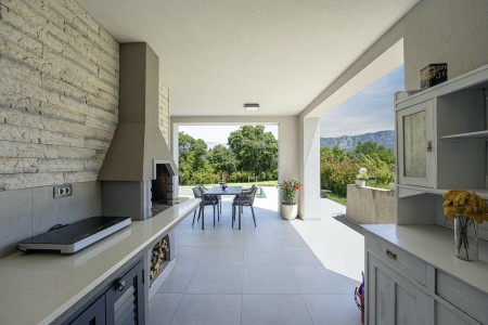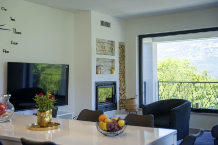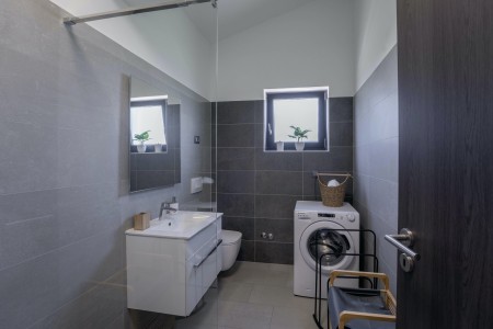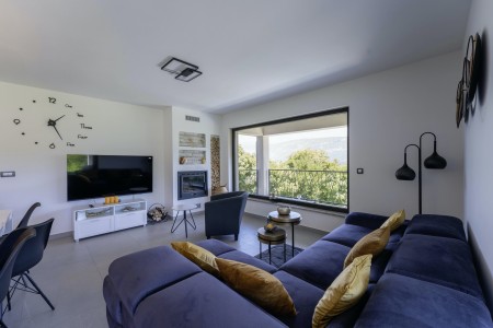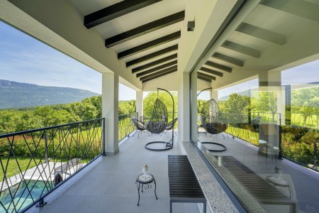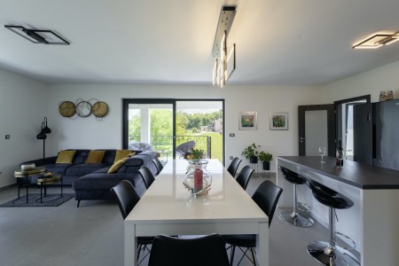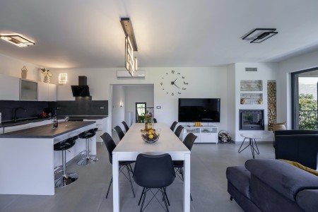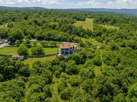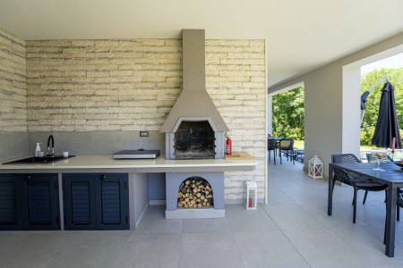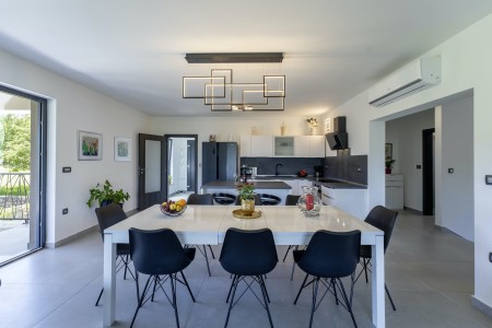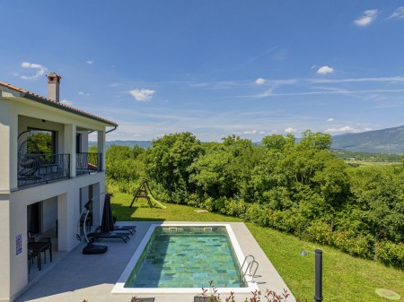 The modern, fully detached villa is located in Blaškovići, a very peaceful village within the Kršan municipality. Surrounded by lush greenery and a uniquely beautiful landscape of expansive fields, meadows, and forests, it offers a perfect retreat for relaxation. The well-maintained outdoor area includes a private swimming pool (4 x 8 m) with a sun terrace and loungers, a fully equipped summer kitchen with a barbecue fireplace and a covered outdoor dining area. Younger guests will delight in their own little playground with a swing and slide. The luxuriously furnished house provides all conceivable amenities and offers a uniquely beautiful view of Mount Učka and its highest peak, Vojak. The area is ideal for extensive bike rides and hikes through evergreen nature, and climbing Mount Učka rewards with breathtaking views. The villa is also perfectly suited for a beach holiday, with the “Copacabana” beach beneath the historic town of Plomin just 7 km away, and the well-known beaches in Rabac about 20 km away. Restaurants and shopping facilities are located in Kršan (2 km), and the area's best pizzeria can be found in the picturesque old town of the hillside town of Labin (12 km).