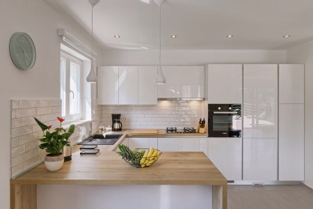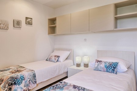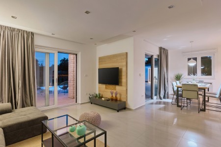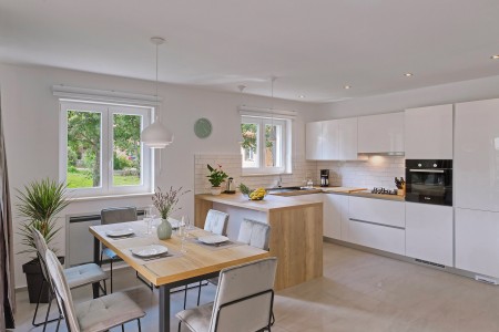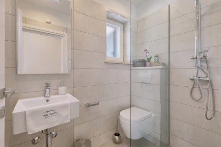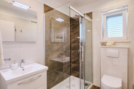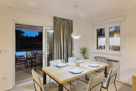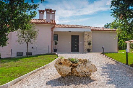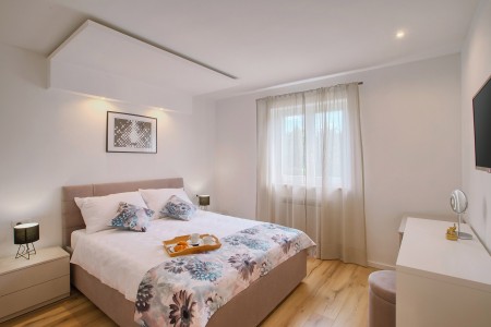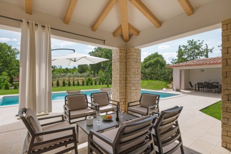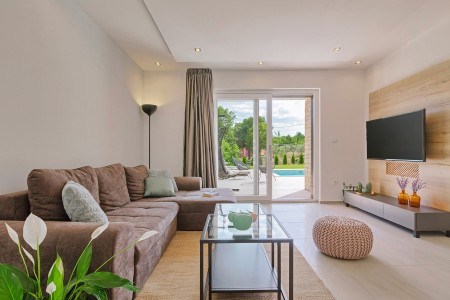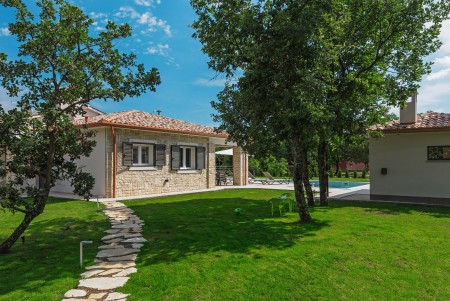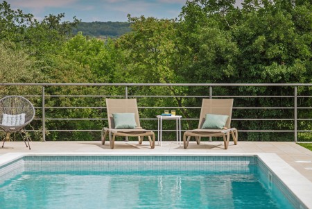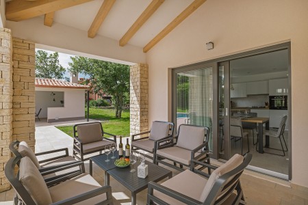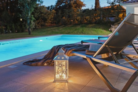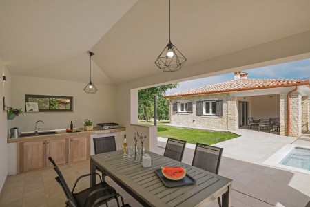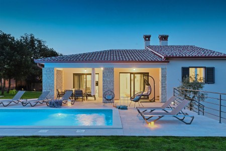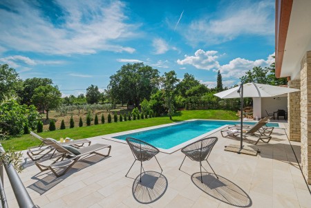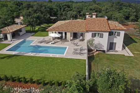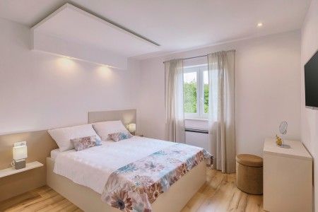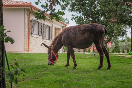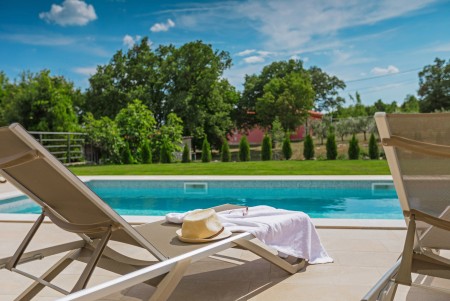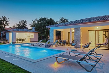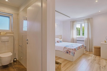 The new, comfortably furnished villa is located in Breg, a small village near Labin, situated above the coastal town of Rabac. At the end of a cul-de-sac, idyllically situated in the countryside, you can feel completely undisturbed and enjoy your peace and privacy. The 1400 m² plot is surrounded by meadows, fields and vineyards and cannot be seen from the outside. In addition to a private swimming pool (7 x 10 m) with sun terrace and deckchairs, it also offers a covered terrace with outdoor barbecue and dining area. The numerous family-friendly pebble beaches of Rabac (approx. 5 km) as well as romantic natural bays on the east coast of Istria can be reached by car in a few minutes. Shopping facilities, restaurant and everything else for your daily needs can be found in Labin, whose old town is also worth a visit and is about 5 km away from the property.