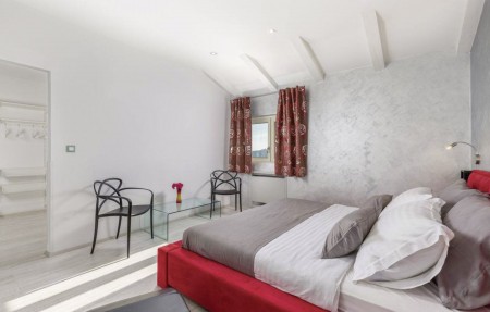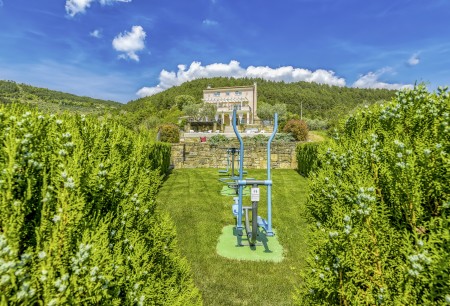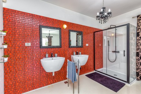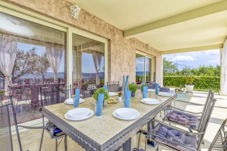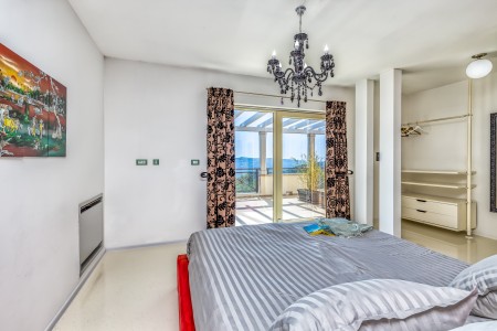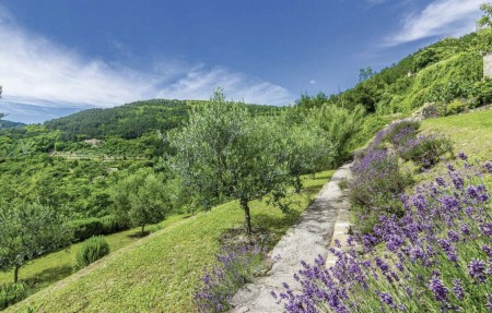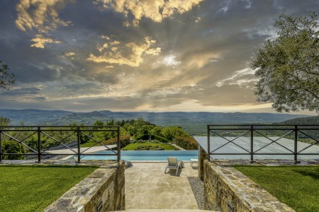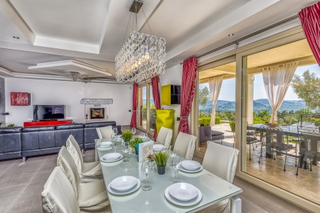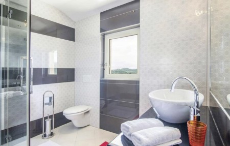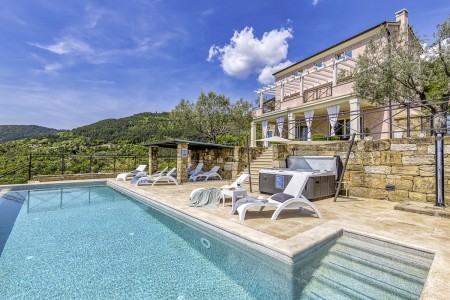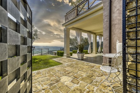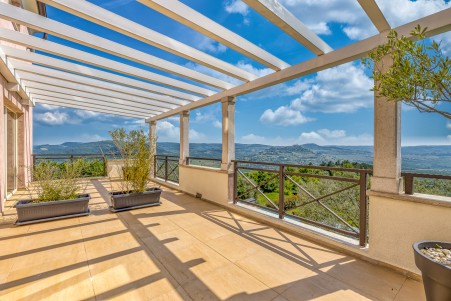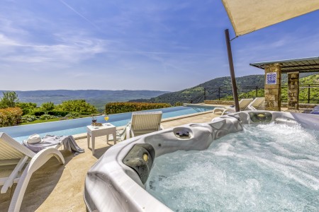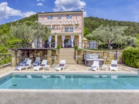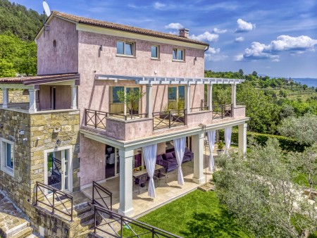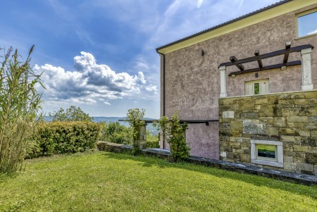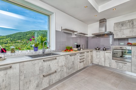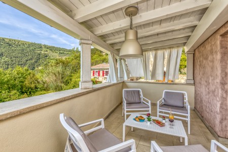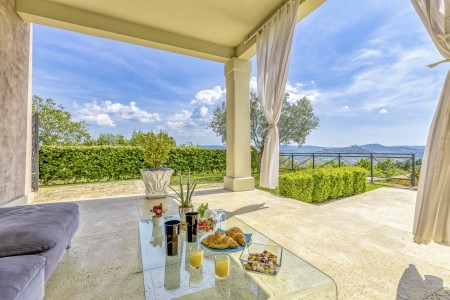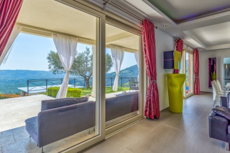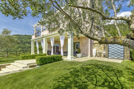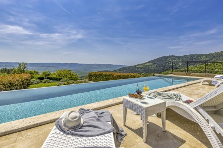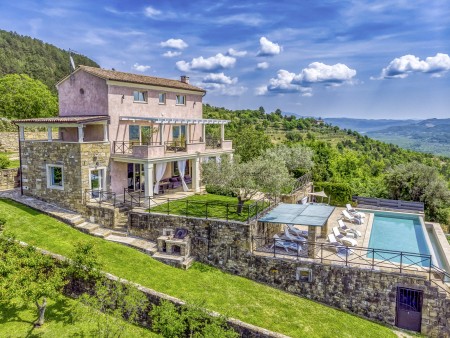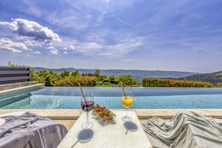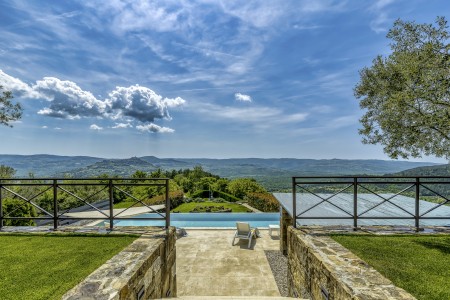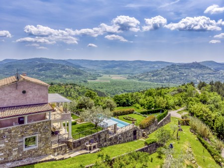 The property, consisting of a comfortable Venetian-style villa and a 1,500 m² private plot with terraced gardens, is located in the north of Istria, in the enchanting evergreen hinterland. Situated 280 meters above sea level and surrounded by a gorgeous countryside with rolling green hills, vast meadows, vineyards, and olive groves, Villa Pasini is just right for a peaceful and relaxing vacation and is the perfect setting for those who want to be close to the coast, but love to return to the peace and tranquility of the countryside after a day exploring. The Villa comprises four bedrooms and four bathrooms, offering exceptional comfort as well as stunning views. As soon as you open your eyes in the morning, you will see the breathtaking, evergreen landscape framed by the blue of the sky, while at night the twinkling stars create a very special and romantic atmosphere. It is hard to imagine a more beautiful setting for a relaxing vacation in a quiet, private atmosphere. Enjoy magnificent views of the historic hilltop town of Motovun, the valley of the Mirna River, Lake Butoniga and last but not least endless vineyards, forests and meadows that cover the amazing hilly landscape. The lively towns such as Novigrad and Poreč on the coast with their numerous beaches can be reached in about 20 minutes by car. You will find shopping facilities in Motovun, about 3 km away, whose old town perched on a hill is definitely worth a visit. The nearest restaurant is about 1 km away and is located in Livade, known for its truffle specialties, because the surrounding forests are home to this precious delicacy.