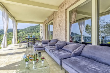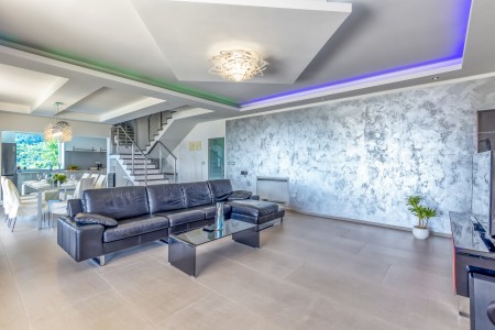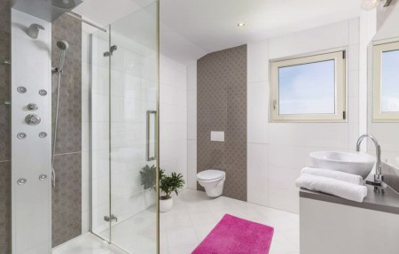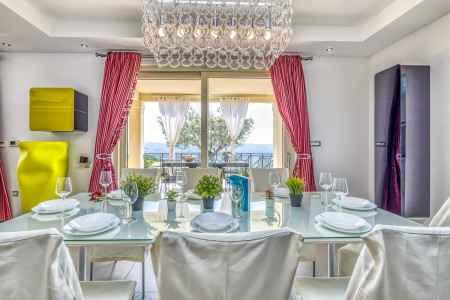 House for 8 persons: approx. 245 m² on three floors, comfortable and modern furnished. On the ground floor is a spacious living area with panoramic windows, comfortable sofa set, air conditioning, fully equipped kitchen and dining area with direct access to the large covered terrace with outdoor dining and lounge area - a perfect spot to enjoy an afternoon bite in the sun or a glass of wine. Furthermore, there is a bathroom with shower on the ground floor. The first floor comprises two air-conditioned bedrooms with double beds. One of the bedrooms includes a cleverly integrated shower, two sinks, and a toilet. Both bedrooms have access to a shared balcony, offering breathtaking panoramic views. Additionally, the second bedroom has its own private balcony. On the top floor there are two bedrooms with double bed, air conditioning and two bathrooms with shower.