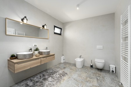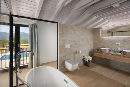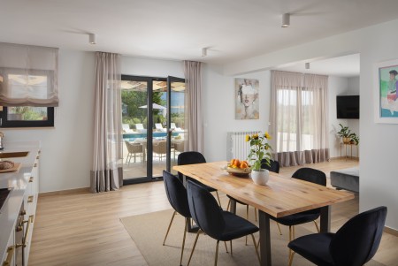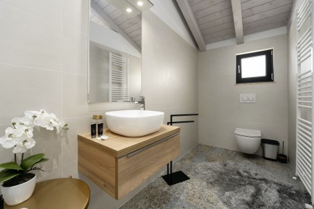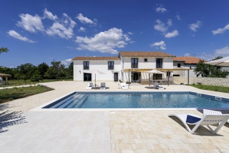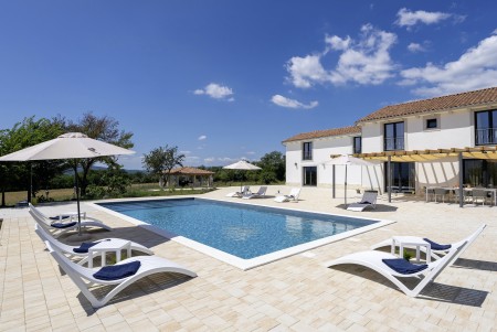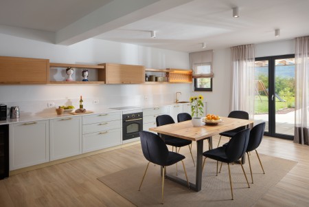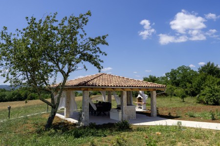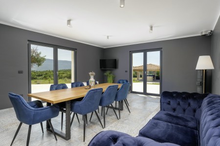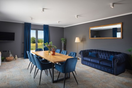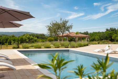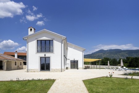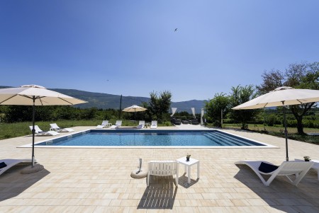 In an absolutely quiet location with panoramic views of Mount Učka and the evergreen, unspoiled nature, the recently renovated villa is located on a large private plot (8,000 m²), which is completely for your exclusive use. Surrounded by a truly unique countryside with rolling green hills, extensive fields, meadows and forests, this place is just perfect for a relaxing holiday in peaceful and private atmosphere. Besides a private swimming pool (12 x 8 m) with sun terrace, lounge corner, outdoor shower and sun loungers, the huge outdoor area also offers a barbecue pavilion with outdoor dining area. For younger guests, there is also a playground with a slide and a swing. The interior of the house is modern and luxuriously furnished and offers a high level of comfort. The surrounding area is ideal for extended bicycle tours and hikes through the evergreen countryside, and those who climb the mountain Učka will be rewarded with breathtaking, panoramic views of Istria. And also for a beach vacation you are in the best place, because the beach "Copacabana", located below the historic town of Plomin, can be reached by car in only 10-15 minutes. The more frequented beaches in Rabac are about 23 km away.