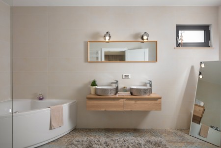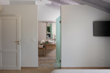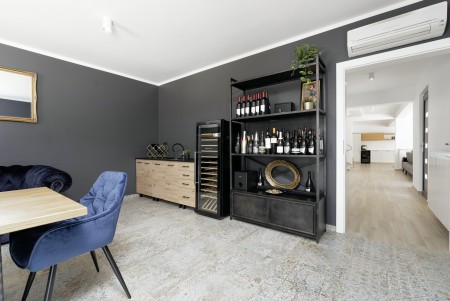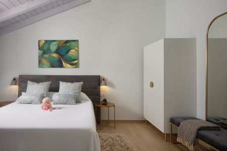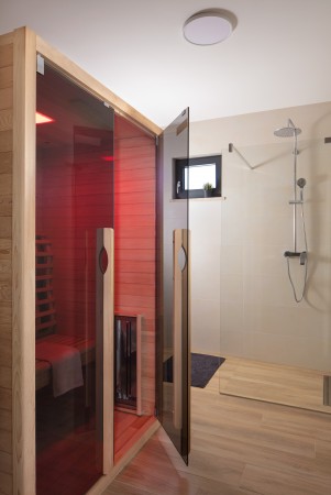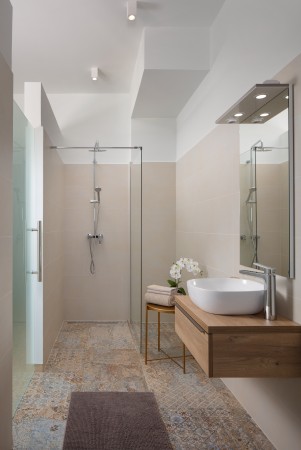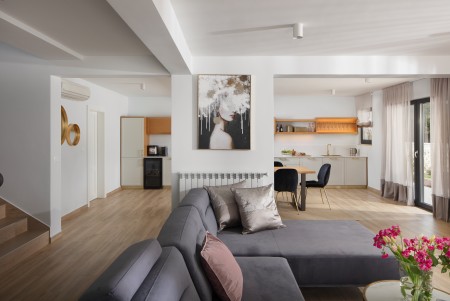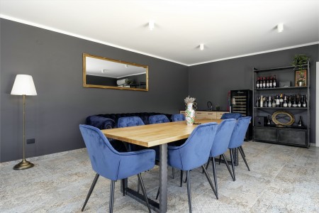 House for 8 persons: approx. 300 m² on two floors, tastefully furnished to a high standard. On the ground floor there is a large open-space living room with comfortable couch, air conditioning, TV, dining area and fully equipped kitchen with direct access to the terrace. Furthermore, the ground floor offers a lounge room with air conditioning, TV, couch, dining table and wine cooler as well as kitchenette, a luxurious bathroom with corner bathtub and shower, a separate WC, and a sauna with shower. On the first floor there are two bedrooms with double bed, air conditioning, TV, and each with private bathroom with shower, one additional bedroom with double bed and air conditioning, and a very comfortable master bedroom with double bed, air conditioning, TV, and stylish integrated bathroom with two washbowls and bathtub.