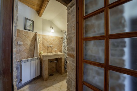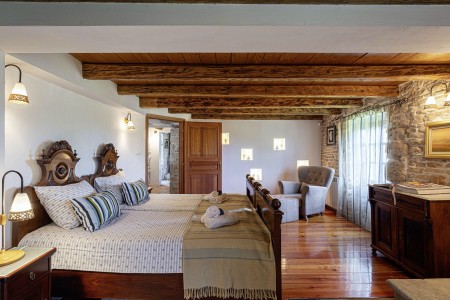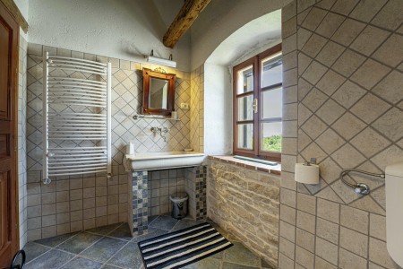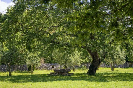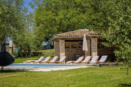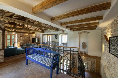 makes this property a real treat, but also its size and comfort. Those who value peace and privacy will feel at home from the very first moment. The large garden, framed by stone walls, offers privacy and security for children to play and adults to relax. Ancient oaks provide shade in the garden, complemented by extensive, well-kept lawns, a small field, and an own olive grove. Additionally, there is a large swimming pool (10 x 5 m) surrounded by a sun terrace with sun loungers and a parasol, a large barbecue fireplace, and a bocce court. The covered terrace offers a wonderfully shaded spot right by the pool. Heading inside you will find spacious and comfortable rooms decorated with lots of lovely details. Almost every room has its own exit to the outside – whether to the garden, the covered front terrace, or the sheltered loggia on the second floor.