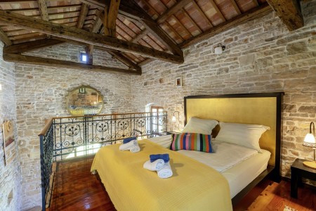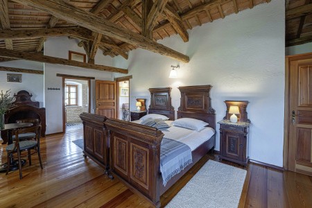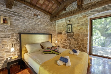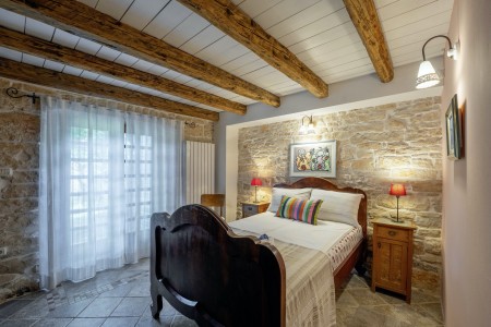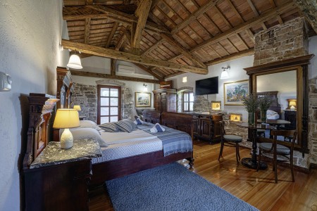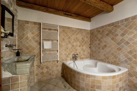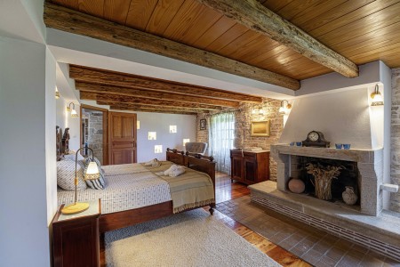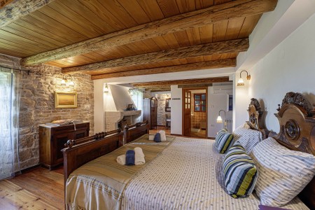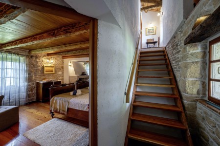 Two houses for 8-9 persons: The larger residential house comes with a living space of approx. 280 m², spread over three floors. On the ground floor there is a fully equipped kitchen opening onto a cozy terrace in the secluded backyard – the perfect place for romantic al fresco dinners. Furthermore there is a bedroom with king-size bed and en suite bathroom with shower, a spacious dining area with an impressive open fireplace, and a separate bathroom with bathtub. Beautiful wooden stairs lead to the first floor, where you can find a double bedroom with king-size bed, air conditioning and en suite bathroom with shower, a comfortably furnished living area with air conditioning and flatscreen TV, and a large covered terrace with seats, from where stone stairs lead directly to the garden. The second floor (attic) features a large bedroom including a king-size bed, a single bed, air conditioning, flatscreen TV, and an en suite bathroom with bathtub. This bedroom opens onto a covered terrace with stunning views of the gorgeous Mediterranean landscape. The smaller house comes with approx. 60 m² of living space, spread over two levels. On the ground floor there is a living area, and a bathroom with bathtub. Stairs lead up to the air-conditioned loft, where you can find a king-size bed and a lovely terrace facing the swimming pool.