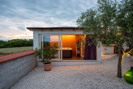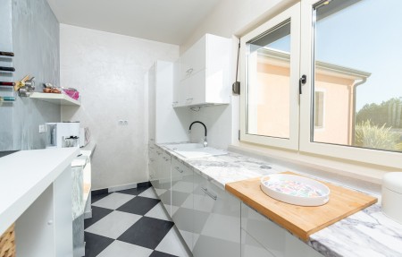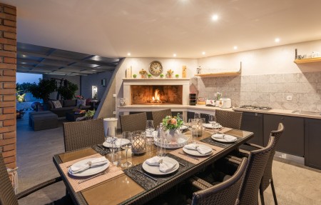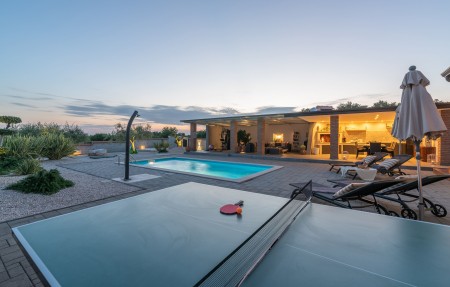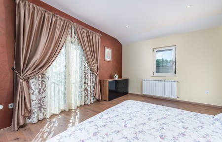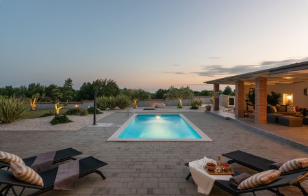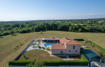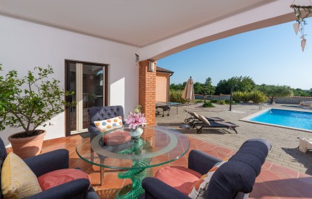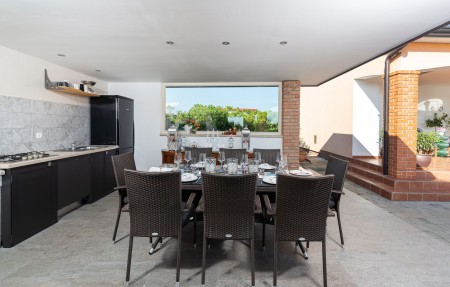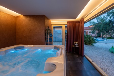 The detached villa is located on private plot of 2,000 m² just outside the village of Radetići. The interior of the villa is tastefully decorated and offers a high level of comfort with four bedrooms and two bathrooms. Well thought out and adapted to high standards, the house is equipped with all the amenities for a relaxing stay and is suitable for families as well as couples, because everyone can find their retreat here. Beyond the private swimming pool (6 x 4 m) with a sun terrace, loungers and parasols, guests will find a generous covered outdoor area designed for relaxation and leisure. This space features a summer kitchen equipped with a grill, sink, refrigerator and stove, as well as a dining table with chairs for convivial meals outdoors and a stylish lounge area with plush seating enhances the inviting ambiance. There is also an integrated fitness corner with fitness equipment, which is perfect for sporting activities during your stay. An additional highlight is the separate wellness area in the garden, which includes a jacuzzi. Thanks to the large glass fronts, you can enjoy the view of greenery and completely relax. While you can enjoy your peace and privacy in the green surroundings of Radetići, the lively coastal resorts such as Poreč, Vrsar and Rovinj with a wide range of restaurants, shopping facilities and nightlife are just a few minutes away by car. In addition, this stretch of coastline attracts with many wonderful beaches for swimming and sunbathing as well as countless opportunities for outdoor sports activities.