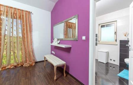 House for 8 persons: approx. 200 m², spread across two floors. The ground floor comprises living/dining area with air conditioning and direct access to the terrace, as well as a fully equipped kitchen with its own terrace access. This level also includes three bedrooms – two bedrooms are equipped with a double bed, air conditioning and a TV, while the third bedroom is furnished with a double bed and air conditioning. There is also a bathroom with a bathtub and a shower, as well as a separate WC. On the first floor there is a bedroom with a double bed, air conditioning, TV and access to the balcony, as well as a bathroom with a shower.