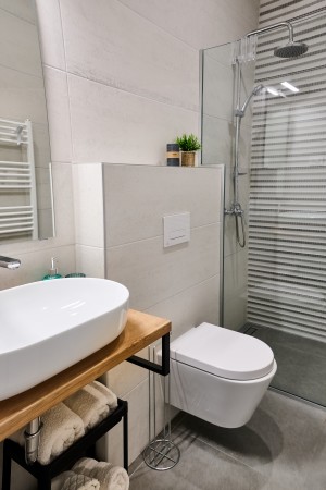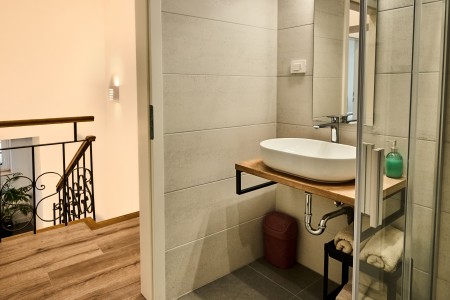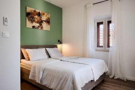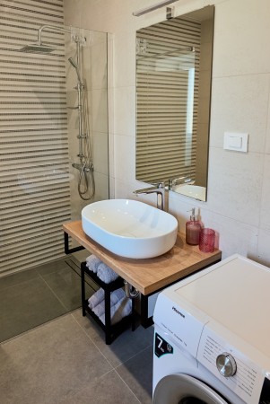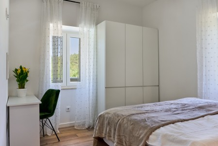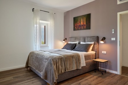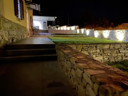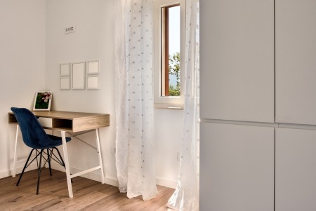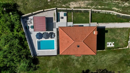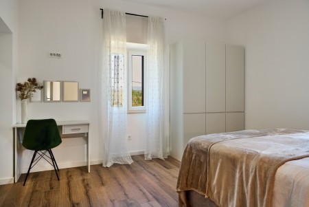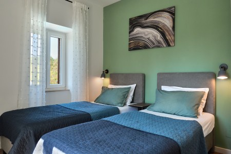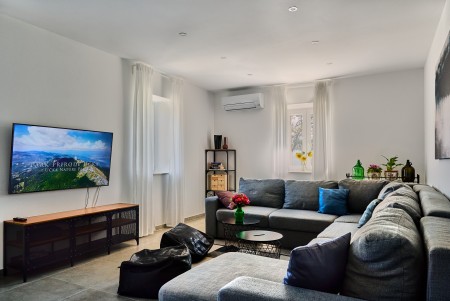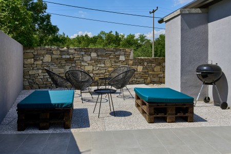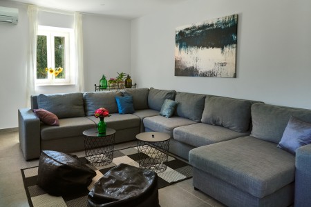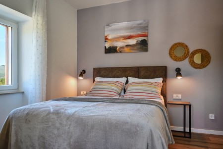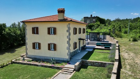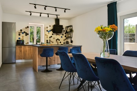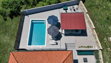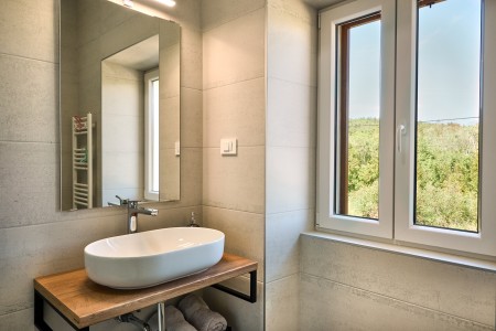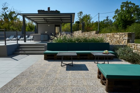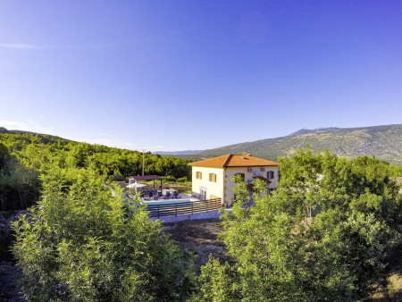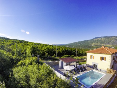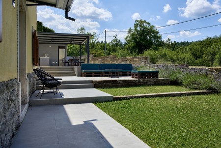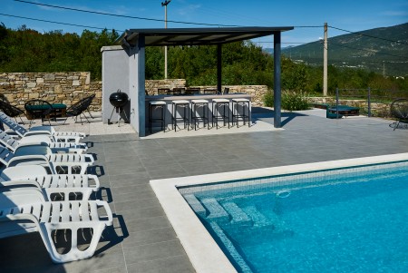 The detached villa is suitable for up to ten people and is located in Kostrčani, a small village near the east coast of the Istrian peninsula. Here you will enjoy not only complete privacy, but also unique panoramic views of the evergreen countryside and Mount Učka. The villa is located on a private plot, which is completely for your exclusive use. Surrounded by a gorgeous landscape and a uniquely beautiful countryside with extensive olive groves, vineyards and forests, it is just wonderful to relax here in peace and privacy. Look forward to a private swimming pool (7 x 4 m) with sun terrace, outdoor shower and sun loungers. A highlight is the covered summer kitchen by the pool with refrigerator, stove, sink and counter with bar stools, so that cool drinks are always at hand and you can prepare some snacks al fresco whenever you like. The interior of the house is modernly furnished and equipped with all amenities needed for a relaxing and comfortable stay. The surrounding area is perfect for long bike rides and hikes through the evergreen nature, and those who climb the mountain Učka will be rewarded with a breathtaking view. The lovely beach "Copacabana", set below the historic town of Plomin, can be reached by car within only 15 minutes. The more frequented beaches in Rabac are about 25 km away.