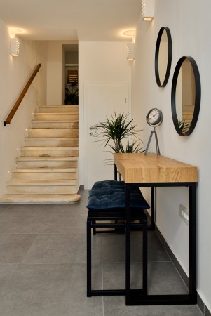 House for 8-10 persons: approx. 150 m² on two floors. On the ground floor, there is a modern, fully equipped kitchen with dining area and TV, a tastefully furnished living room with sofa bed (160 x 200 cm) and air conditioning, and a bathroom with shower. The first floor comes with three comfortable bedrooms with double bed, one bedroom with two single beds and three bathrooms with shower. All bedrooms are equipped with air conditioning.