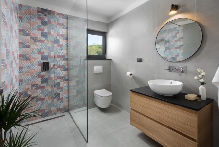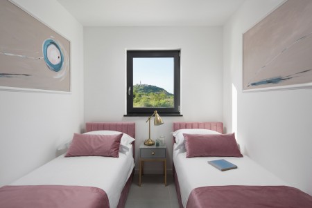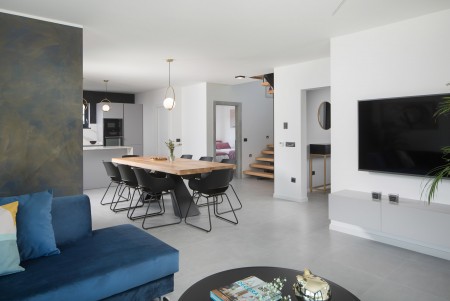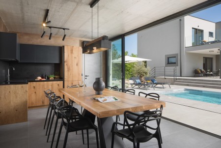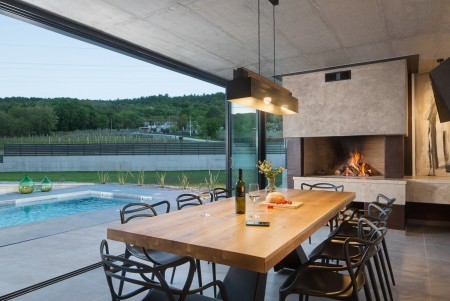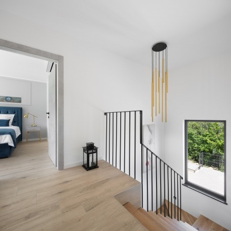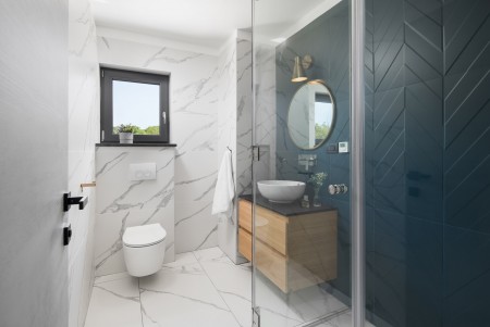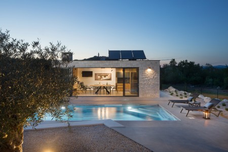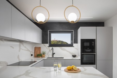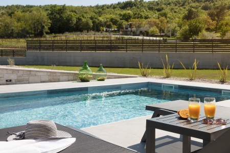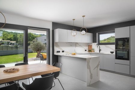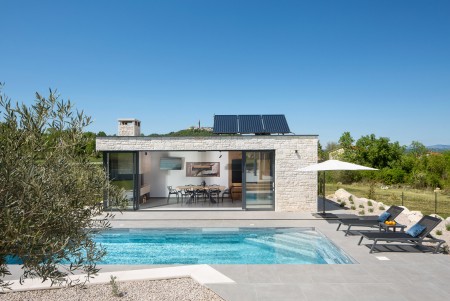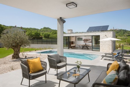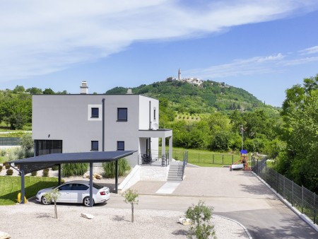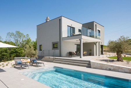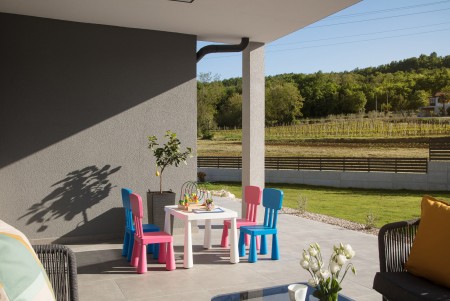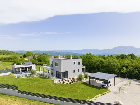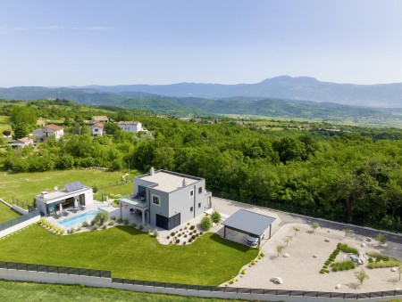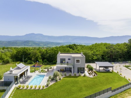 This brand-new designer villa in a desirable detached location is situated in Kukurini, a small village not far from the historic town of Pićan, to which you have an enchanting view from the property. Surrounded by a truly unique countryside with rolling green hills, gorgeous olive groves and extensive vineyards, this place is just perfect for a relaxing holiday in peaceful and private atmosphere. The villa is located on a completely fenced plot and the nearest neighbouring house is more than 200 metres away. In addition to a private swimming pool (4 x 8,5 m) with sun terrace, pool house, outdoor shower and comfortable sun loungers, a private children's playground with swing, slide, climbing frame and sandbox awaits you. The interior of the house is very modern and offers a high level of comfort with four spacious bedrooms and three bathrooms. The surrounding area is ideal for long walks and hikes through the evergreen countryside, and those who climb the mountain Učka will be rewarded with breathtaking, panoramic views of Istria. The lovely beach "Copacabana", set below the historic town of Plomin, can be reached by car within 10-15 minutes.