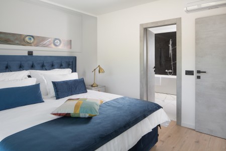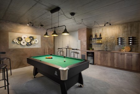 House for 8 persons: about 250 m² on two floors. On the ground floor there is a fully equipped kitchen with dining area, air conditioning and exit to the large terrace, a comfortable living room with air conditioning, a bedroom with two single beds and air conditioning, and a bathroom with shower. On the first floor there are three bedrooms with double bed and air conditioning, a bathroom with shower, and a bathroom with bathtub. Each bedroom has its own TV. In the basement of the villa there is a lounge area with wine bar, pool table and darts. Moreover, the pool house offers an additional amenity, as it comes with another fully equipped kitchen with air-conditioned lounge and dining area, TV and a WC.