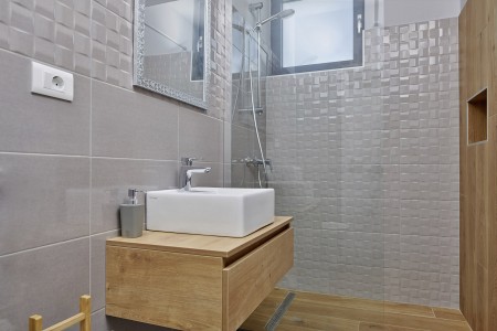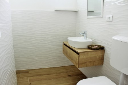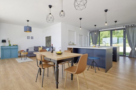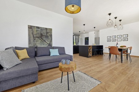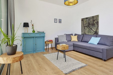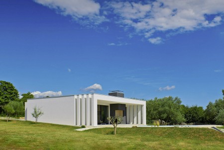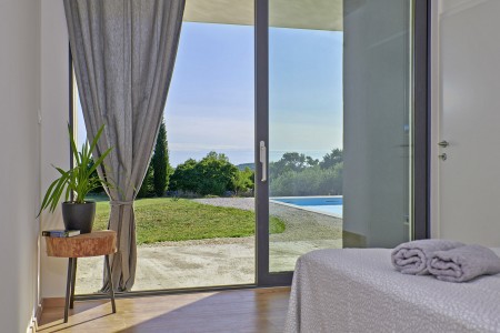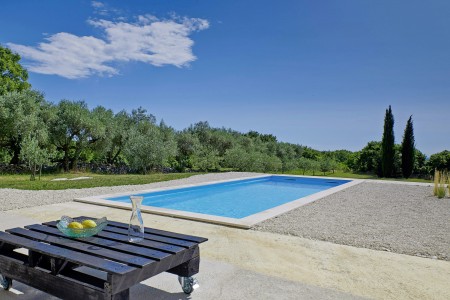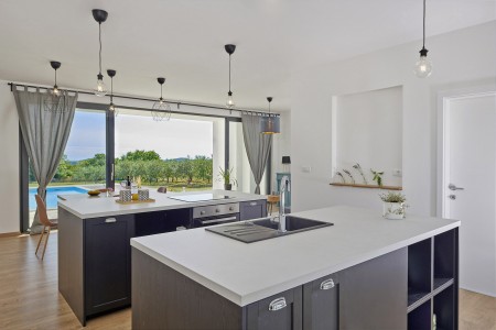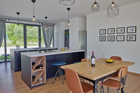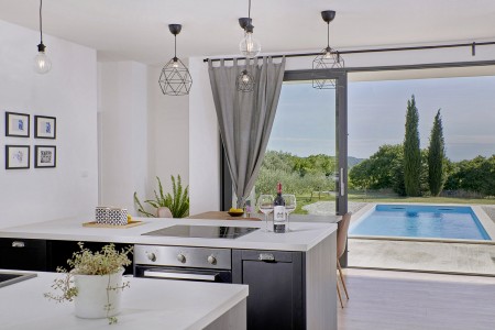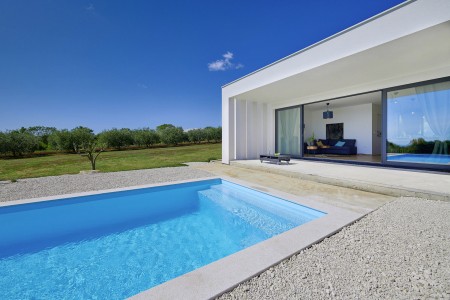 The modern ground-level villa is located in Smoljanci, a small village in the central part of the Istrian Peninsula. Surrounded by typical Mediterranean countryside, it is just perfect for a relaxing vacation. The large backyard (approx. 2000 m²) offers peace and quiet as well as plenty of space for children to play and adults to enjoy their free time in a private atmosphere. Right next to the private pool (8 x 3 m) is a covered terrace with barbecue fireplace and outdoor-dining amenities.