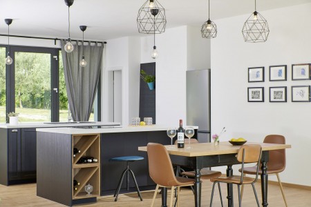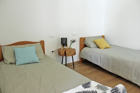 House for 4 persons: approx. 90 m² on ground level. Living/dining area with panoramic floor-to-ceiling windows, a fully equipped kitchen including a modern cooking island, air conditioning and direct access to the covered terrace by the pool. One bedroom with double bed, air conditioning and en-suite bathroom with shower, one bedroom with two single beds, and a bathroom with bathtub.