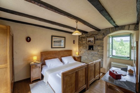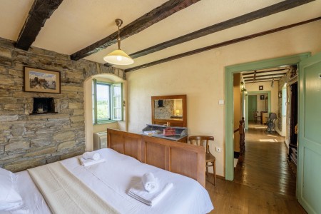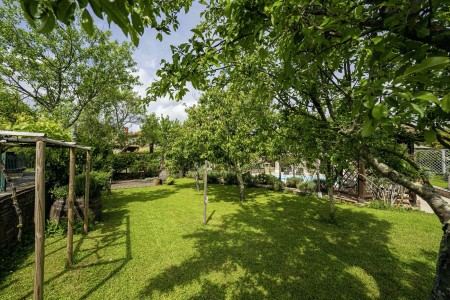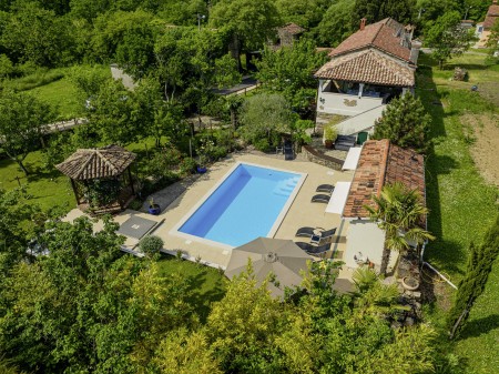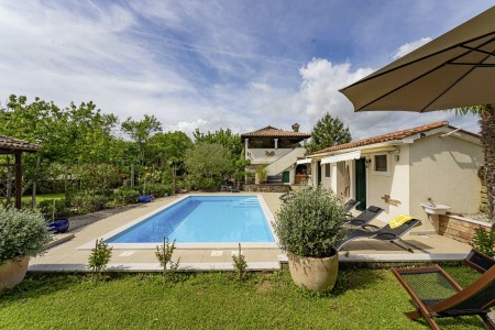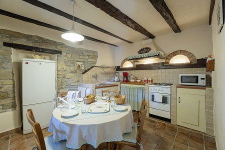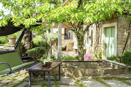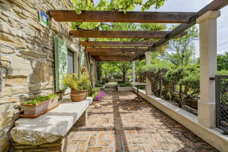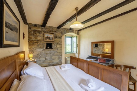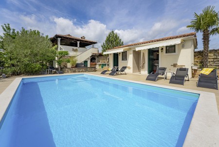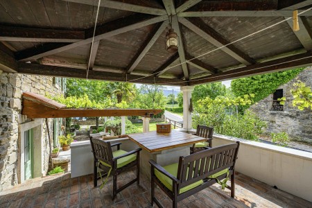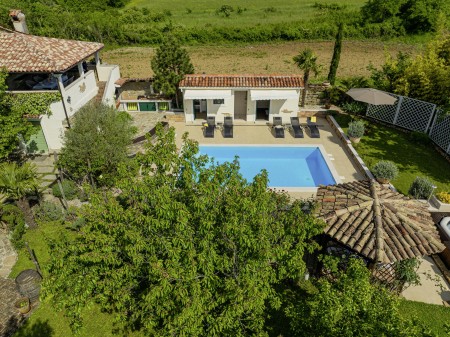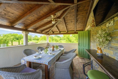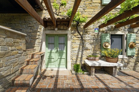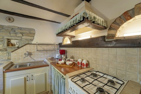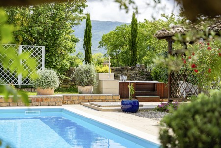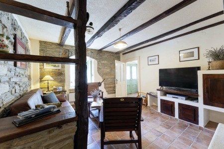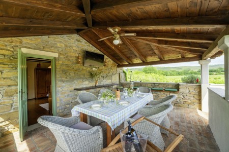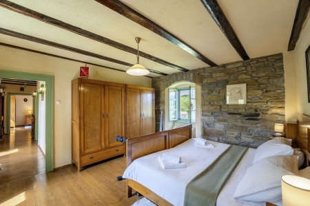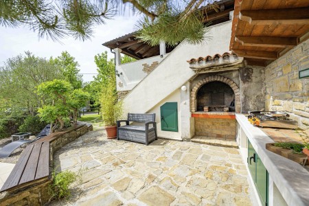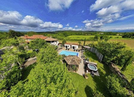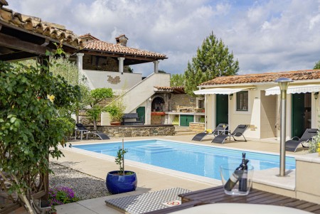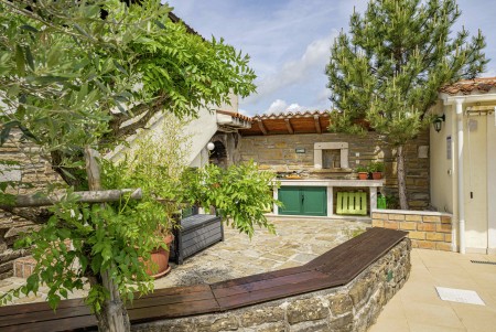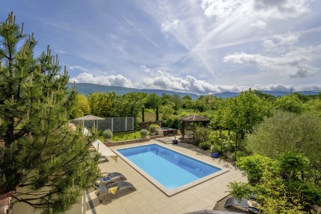 The charming natural stone villa is located in Zatka Čepić, a very peaceful village part of the Kršan municipality. Surrounded by lush greenery and a uniquely beautiful landscape of expansive fields, meadows, and forests, it offers a serene retreat. The well-maintained outdoor area includes a private swimming pool (4 x 7,5 m) with a sun terrace and loungers, a barbecue area, and a fully equipped summer kitchen, as well as a hot tub. The house, decorated with great attention to detail, radiates a special warmth and offers a stunning view of the Učka Nature Park and a 35-meter high bell tower from the 17th century perched on a hill. Notably, the precious white truffle, a prized delicacy also found in France and Italy, thrives in the forests around Zatka Čepić. The region is ideal for extensive biking and hiking through evergreen nature, and climbing Mount Učka rewards with breathtaking views. The area is also perfect for a beach holiday, with “Copacabana” beach beneath the historic town of Plomin accessible by car in just 10-15 minutes, while the more famous beaches in Rabac are about 20 km away.