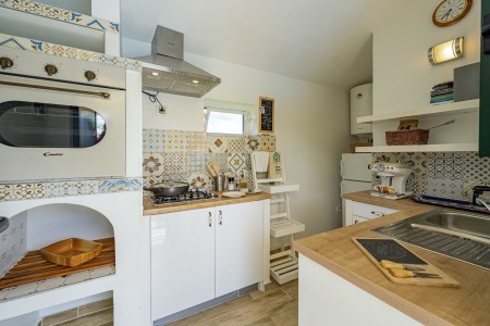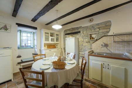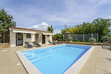House for 6 persons: approx. 100 m² over two floors. The ground floor comprises a kitchen with dining area, a cozy living room with a fireplace and smart TV, and a bathroom with shower. Another bathroom with shower, as well as an additional, fully equipped kitchen (including a dishwasher), are located in the pool house. The first floor has a bedroom with a double bed and air conditioning, a bedroom with two single beds and TV, and a bedroom with a double bed, air conditioning, and access to the covered terrace (about 20 m²) with seating, smart TV, and magnificent views of Mount Učka. An external staircase from the covered terrace leads to the 500 m² garden, enclosed by dry stone walls.