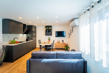 House for 2 persons: approx. 56 m², on two floors. The ground floor features a fully equipped kitchen with a dining/living area, sofa and air conditioning, as well as a bathroom with shower, washing machine and dryer. A staircase leads to the upper floor (open-plan), where there is a double bed, TV, air conditioning, as well as a shower, sauna and jacuzzi, all conveniently integrated into the room.
