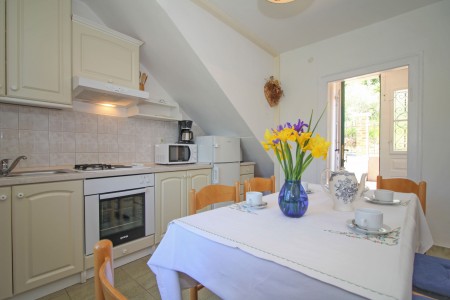 House for 6-7 persons: approx. 91 m² (main house and side cottage). The main house offers about 70 m² on two floors. On the first floor there is a living room with sofa bed for a child up to 14,99 years, a kitchen with dining table and a bathroom with shower. On the second floor, there is one bedroom with double bed and one bedroom with two single beds, air conditioning in the corridor (cools both bedrooms when doors are open). The annex cottage offers 21 m², comprising a living/bedroom with double bed, air conditioning, kitchenette, dining table and a bathroom with shower.