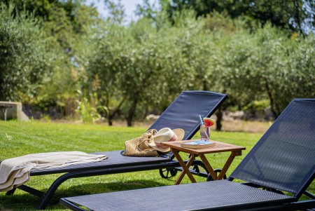 House for 8 persons: approx. 270 m² on two floors, modern and comfortably furnished. On the ground floor, there is a bright living area with comfortable sofa set, open fireplace, air conditioning, fully equipped kitchen and dining area. From here, you have direct access to the large terrace by the pool with barbecue fireplace and outdoor dining table. Furthermore, the ground floor offers a wheelchair accessible bedroom with double bed, air conditioning and TV, a wheelchair accessible bathroom with shower and a separate toilet. On the first floor, there is a bedroom with double bed and air conditioning, a bedroom with two single beds and air conditioning, and two bathrooms with shower. Each bedroom also has a small air-conditioned living area with TV and access to the shared balcony with comfy chairs and views of the pool. In addition, the first floor offers a small kitchenette with kettle, fridge and coffee maker. The recently completed studio apartment (30 m²) on the ground floor features a bedroom with two single beds, air conditioning, TV, a fully equipped kitchenette, dining area, bathroom with shower, as well as a covered terrace with seating.