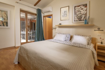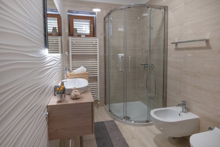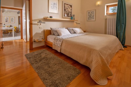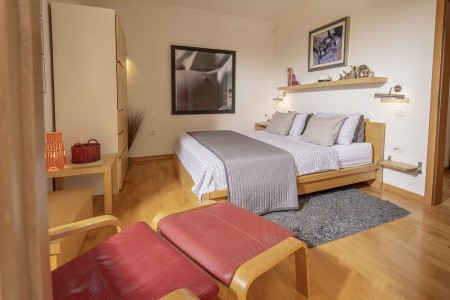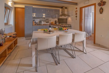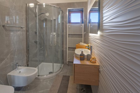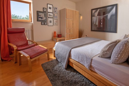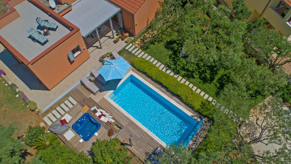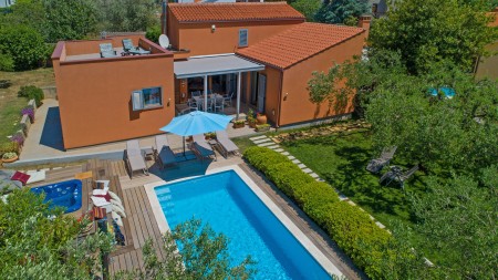This modernly designed and comfortably furnished vacation villa is located in the hamlet of “Regi”, only a few hundred metres away from the center of the lovely seaside town of Medulin. The detached villa accommodates up to five people and is ideal for all those who desire to have a private spot to relax and unwind, while amenities for tourists, beaches, restaurants, bars and shops are within walking distance. Villa Emili is just right for a pleasant vacation, not only due to its favourable location close to Medulin. The villa is surrounded by a well-kept garden including lawns and an olive grove with gorgeous trees that provide shade on warm summer days. A private swimming pool (3,6 x 7 m) with sun loungers and a large sea-view sun terrace on the roof of the house make it all perfect. The pool is heated, which ensures a very agreeable water temperature of approx. 26 degrees Celsius.