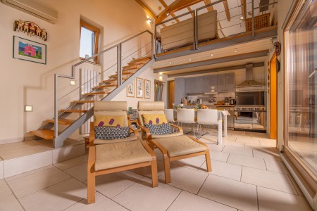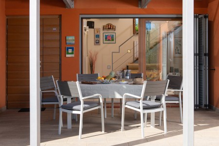 House for 4-5 persons: approx. 100 m², spread over two levels. On the ground floor are two double bedrooms – each with ensuite bathroom with shower, and an open-plan kitchen including a dining/living area and a small fireplace. Stairs lead up to the loft, which is equipped with a sofa bed (sleeps 1). The house is equipped with air conditioning and central heating. Furthermore, there is a cozy, covered terrace on the ground floor – the perfect place to enjoy al fresco dinners accompanied by romantic candle light. An additional covered terrace including barbecue facilities has been installed recently.