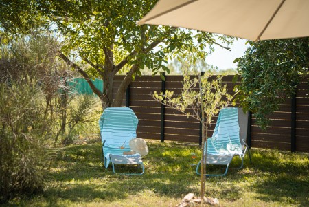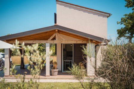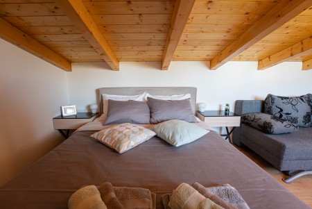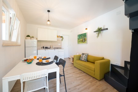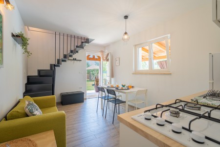 House for 2-3 persons: approx. 43 m², on two floors. On the ground floor there is a living/dining area with kitchen, couch and air conditioning, as well as a bathroom with shower. From the living area a staircase leads to the upper floor comprising a sleeping loft with a double bed, a sofa bed (150 x 190 cm), air conditioning and TV.