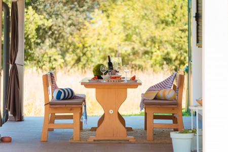 Further details: WiFi available free of charge. Covered terrace with table and benches, sun loungers, parasol and barbecue are available in the partially fenced garden. Free private parking on the property. The kitchen is equipped with a water kettle and a toaster. Water is supplied by its own well. This water is suitable for cooking and showering, drinking water you should buy/bring along. Two bicycles for adults are available free of charge. The final 80 meters to the house are via unpaved road.